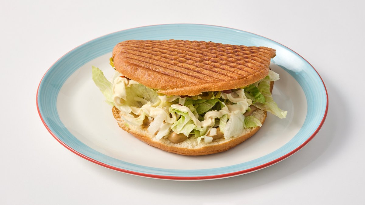 Sämpylä, berliininmakkara, juusto, ketsuppi, maustekurkku, salaatti, kastike