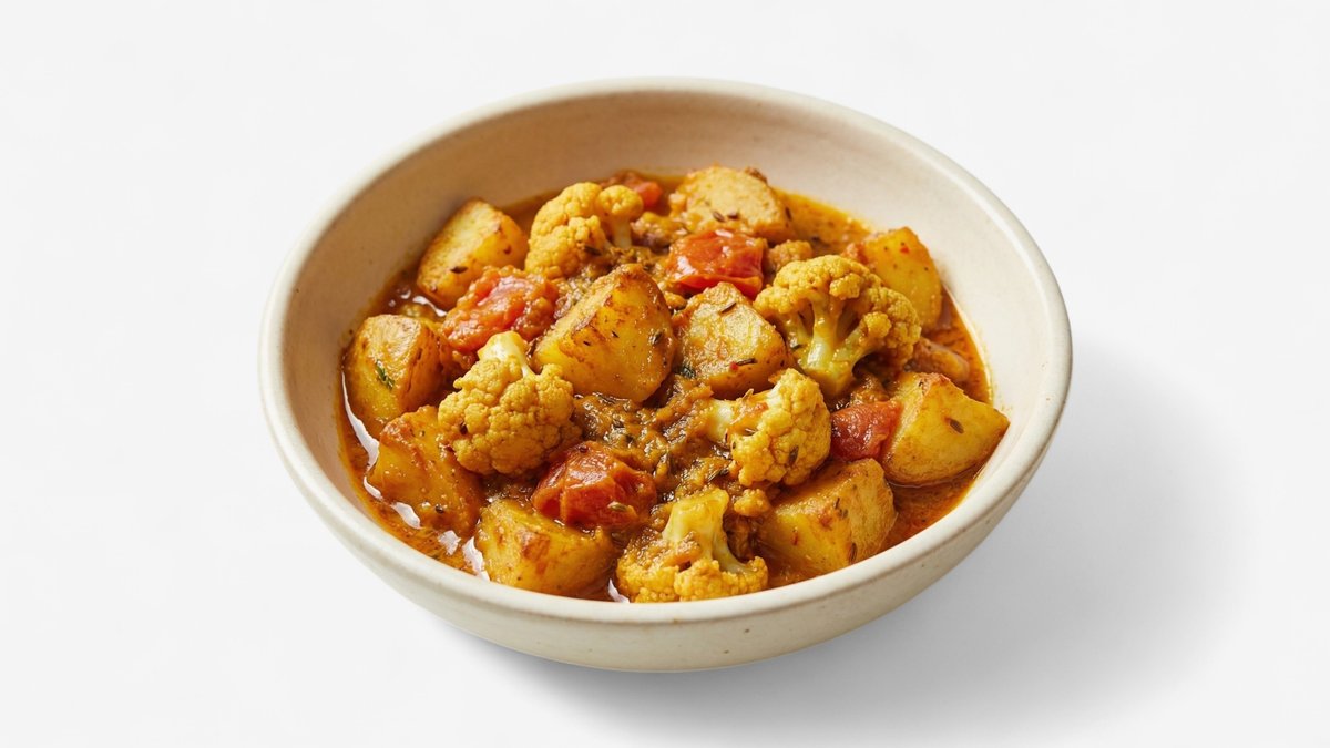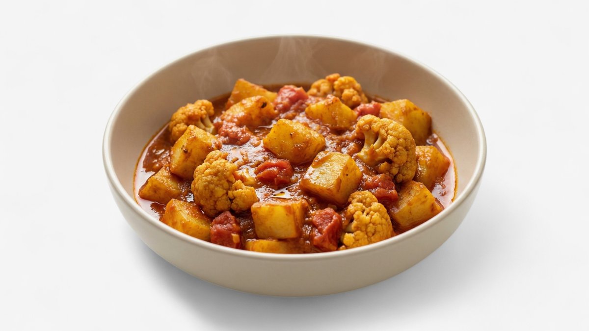 Paistettuja perunoita, kukkakaalia ja tomaattia masala kastikkeessa. Fried potatoes, cauliflower and tomato cooked in masala sauce. (G, L)
