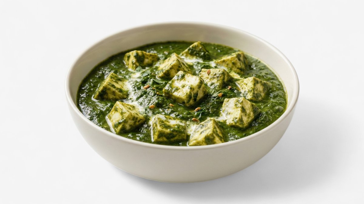 Tuorejuustoa pinaatti, curry ja kerma kastikkeessa. Cottage cheese in spinach, curry & creamy white sauce. (G)