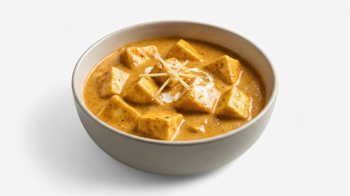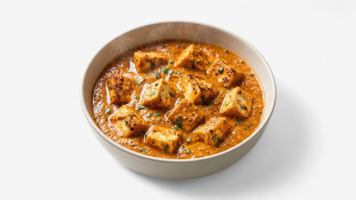 Tuoretta kotijuustoa tomaatti-inkivääri-sipuli-tikka masalakastikkeessa. Fresh cottage cheese pieces in tomato-ginger-onion-tikka masala sauce. (G,P)