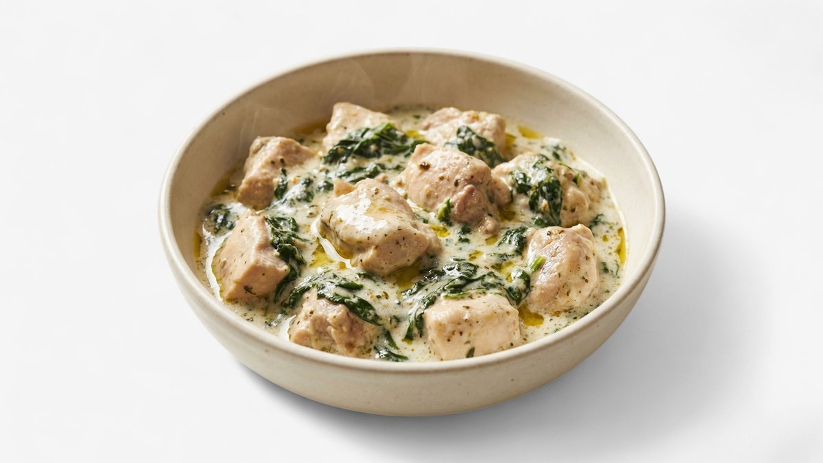 Haudutettuja kanaa pinaatti kermainen & curry kastikkeessa. Stewed chicken pieces with spinach in white creamy & curry sauce. (G,L,P)