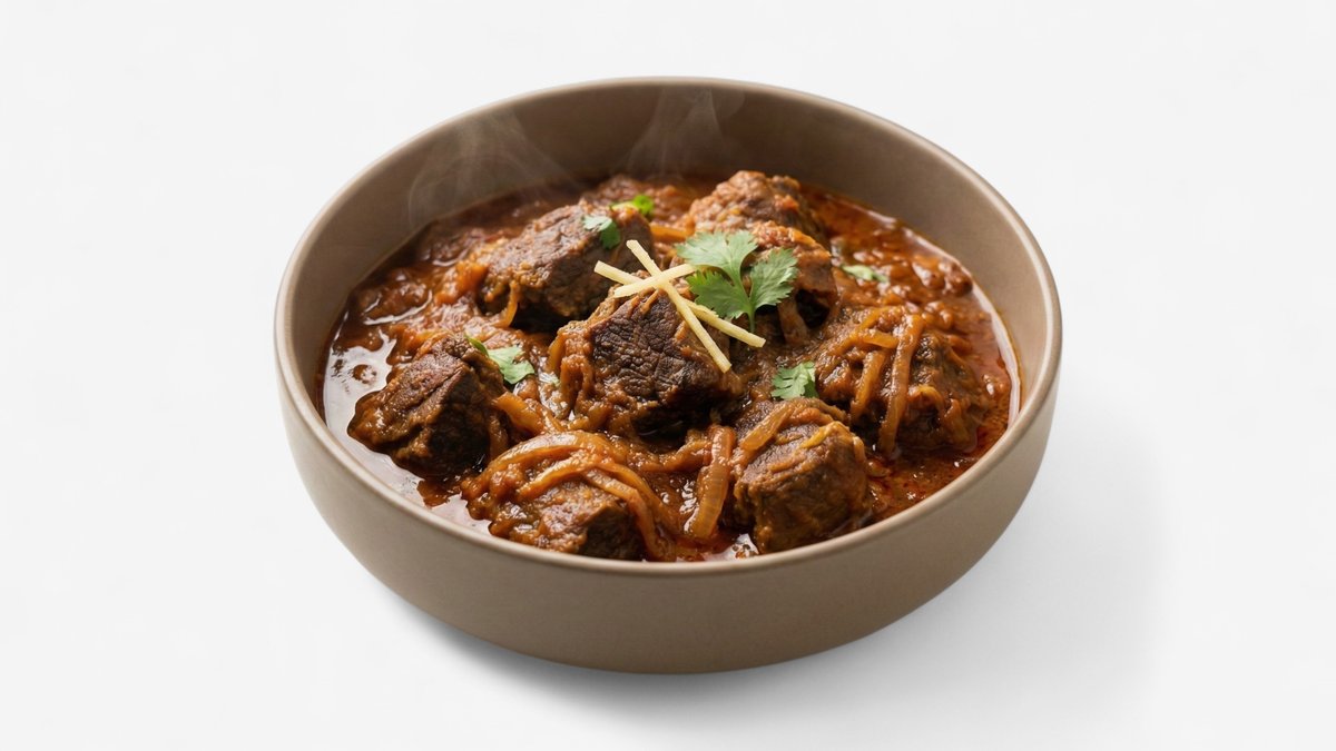 Paistettua lammasta valkosipuli, jogurtti, chili-kastikkeessa. Stewed lamb in garlic, yogurt, chili & curry sauce. (G, L, P)