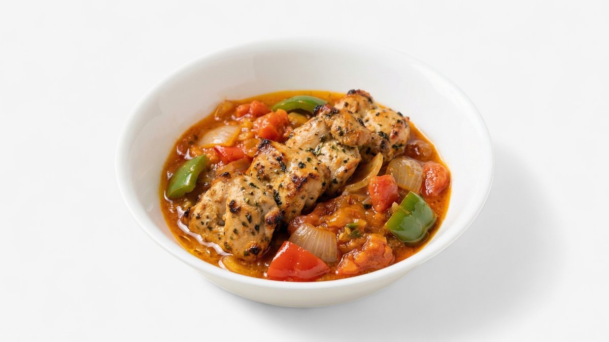 Marinoitua kanaa, paprikaa, sipulia ja tomaattia voikastikkeessa. Marinated chicken breast, capsicum, onions and tomatoes in butter sauce. (G,P)