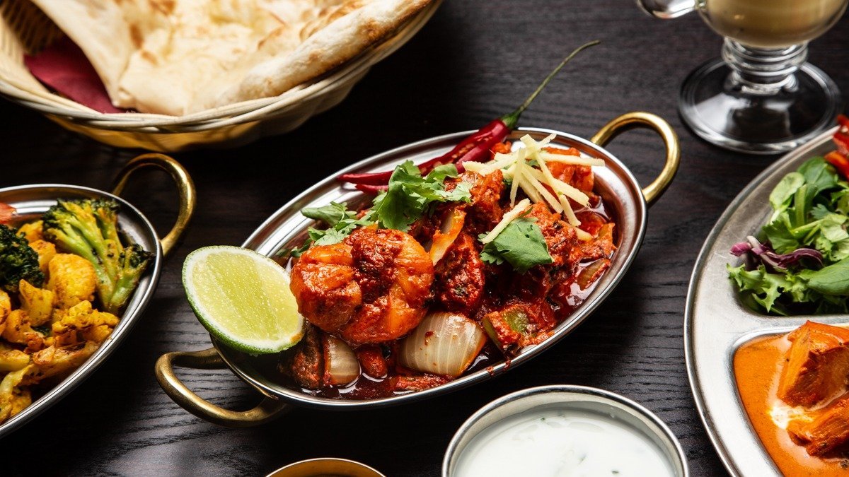 Kuumalla parilalla tarjoiltavaa lammasta, tandoorikanaa, paprikaa, sipulia, inkivääriä, valkosipulia, tomaattia sekä chilikastiketta (G, L)