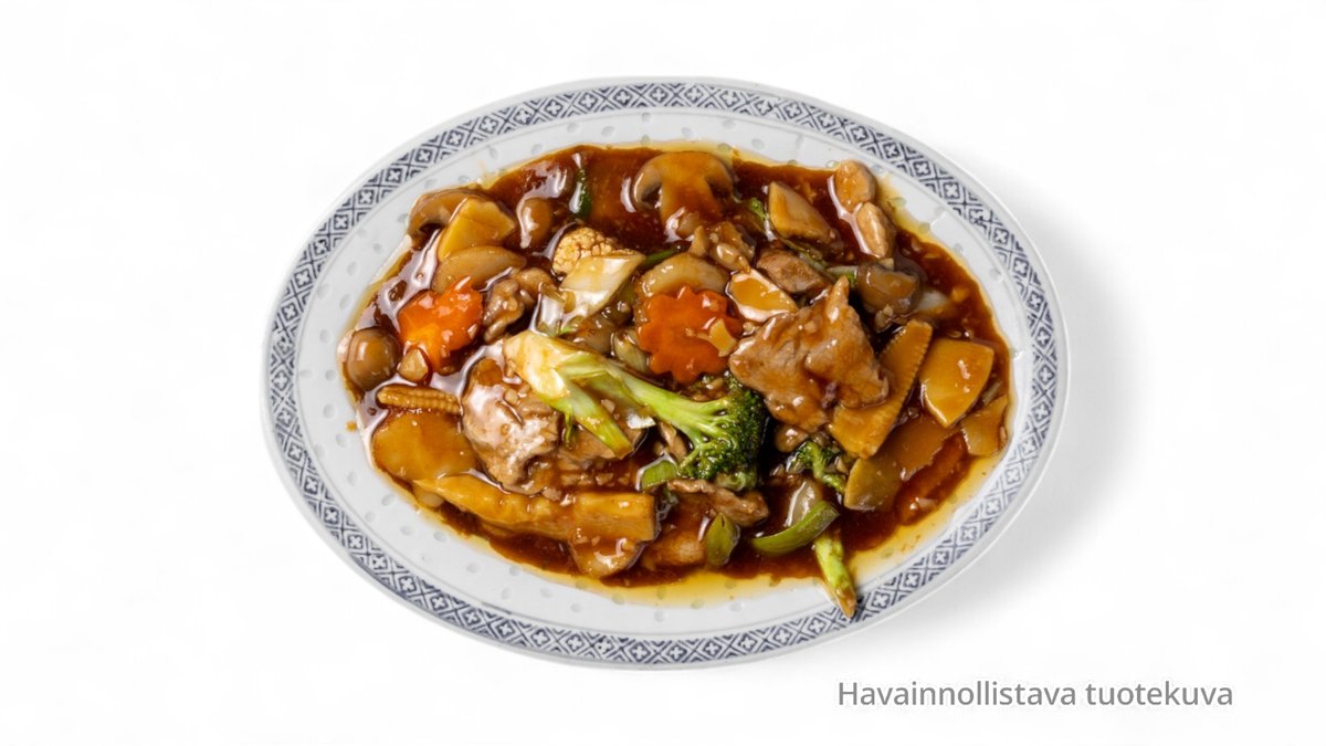 Naudanlihaa ja kasviksia makea-soijakastikkeella. Mukaan riisi