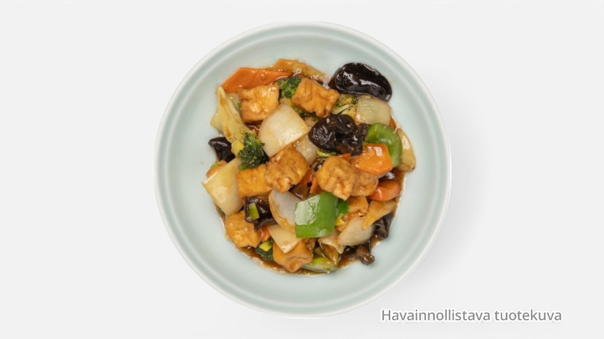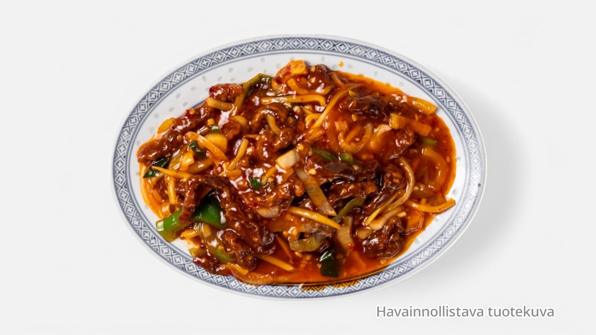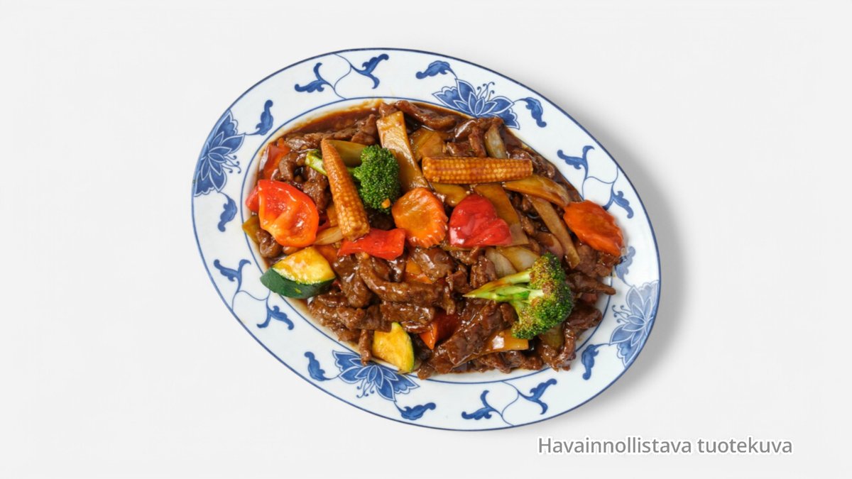Paistettua härkää ja tuoreita vihanneksia makeassa ja hieman tulisessa talon kastikkeessa