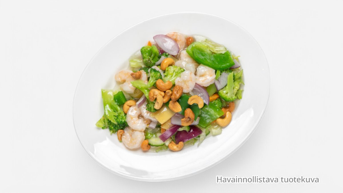 Paistettua katkarapuja tuoreita vihanneksia ja cashewpähkinöitä.Hiema tulinen.G.L.
