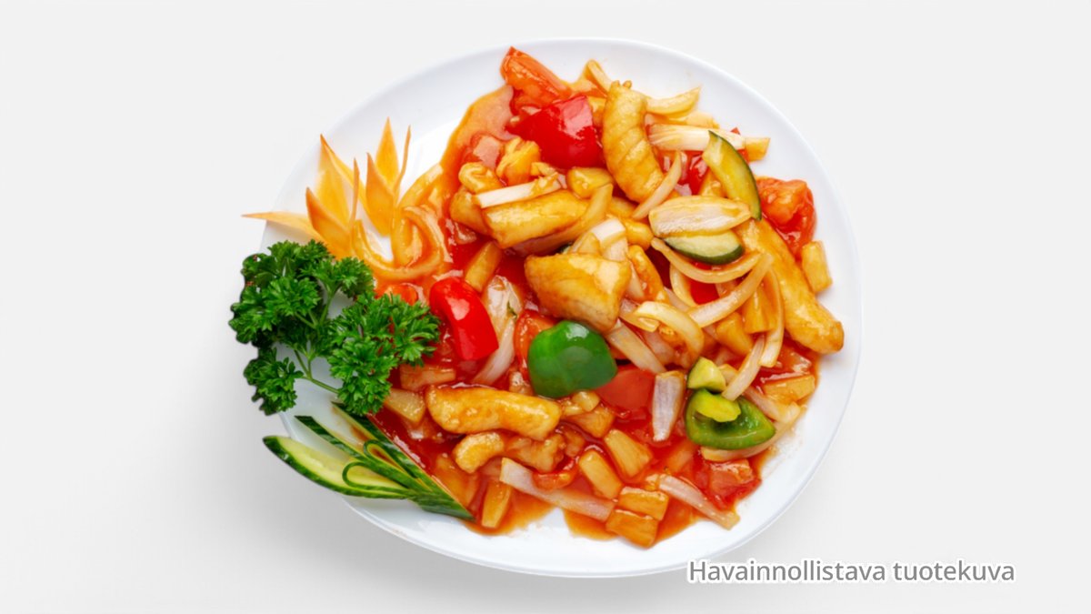 Paistettua kanaa ja tuoreita vihanneksia makeassa hapanimeläkastikkeessa.