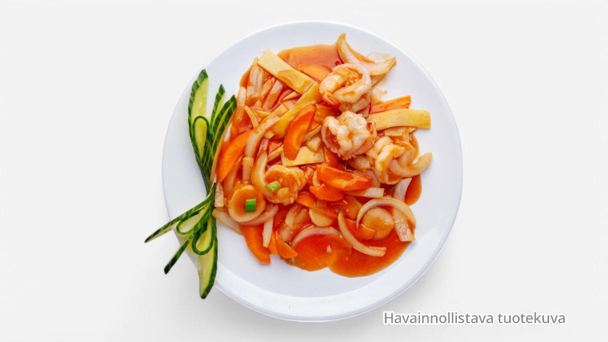 Paistettuja jättirapuja ja tuoreita vihanneksia makeassa ja hieman tulisessa talon kastikkeessa