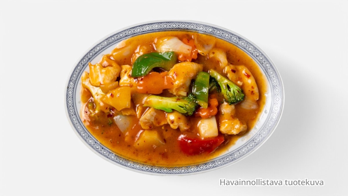 Paistettua kanaa ja tuoreita vihanneksia makeassa ja hieman tulisessa talon kastikkeessa.