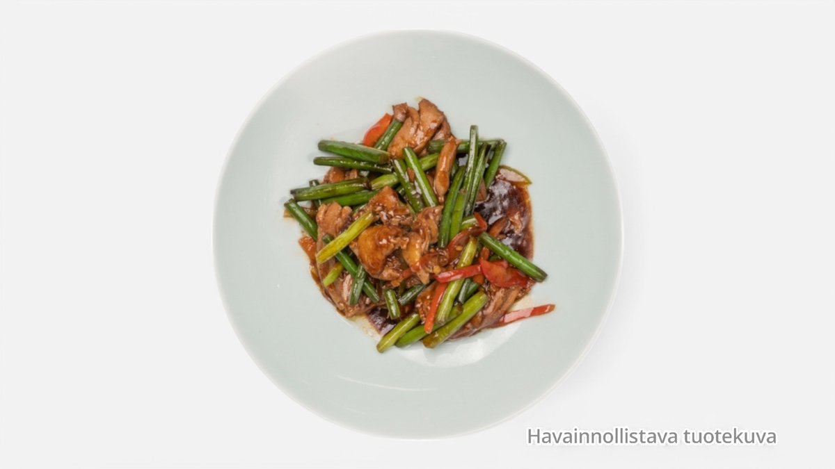 Paistettua kanaa ja tuoreita vihanneksia tulisessa chilikastikkeessa