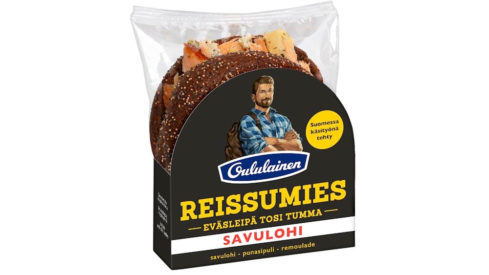Oululainen Reissumies Eväsleipä Tosi Tumma Savulohi täytetty täysjyväruisleipä lohi-punasipuli-remou