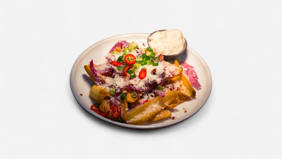 Ranut, pekonimuru, parmesanjuusto, pikkelöity punasipuli, kevätsipuli, chili ja valinnainen dippi.