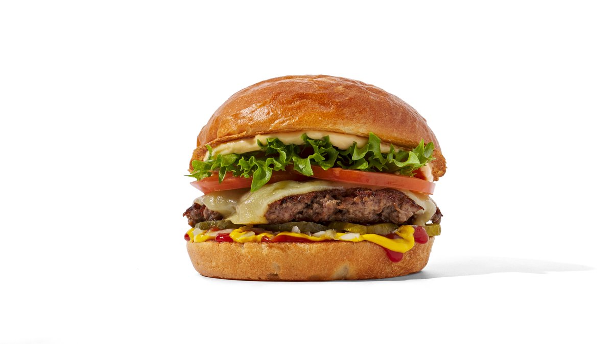 1 x 110g naudanlihapihvi, cheddar sulatejuusto, sipuli, tomaatti, salaatti, Friends-majoneesi.