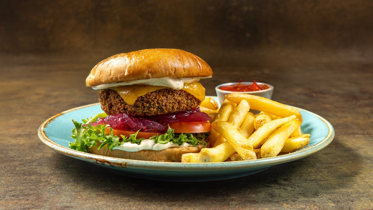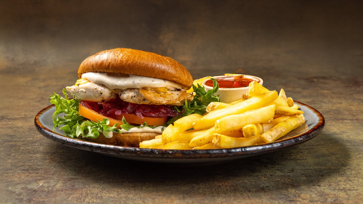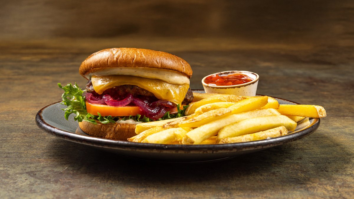 Briossisämpylä, tryffelimajoneesi, jääsalaatti, tomaatti, marinoitu punasipuli ja lämmin cheddarjuustokastike Sisältää ranskalaiset ja talon ketsupin
