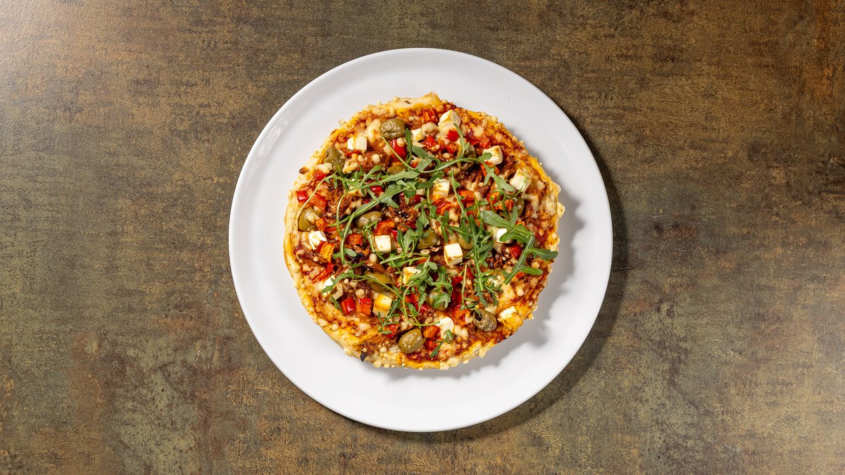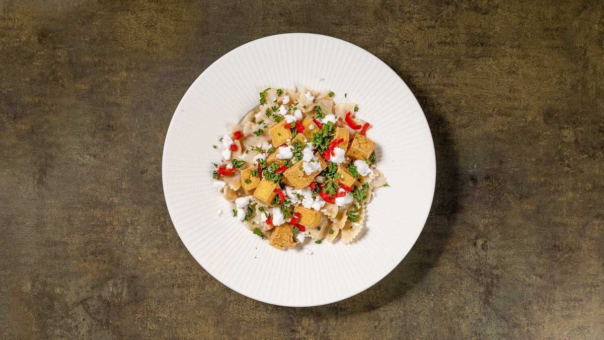 Pastaa, chilillä ja valkosipulilla maustettua kookoskastiketta, vegaanista fetajuustomurua ja valinnainen proteiini