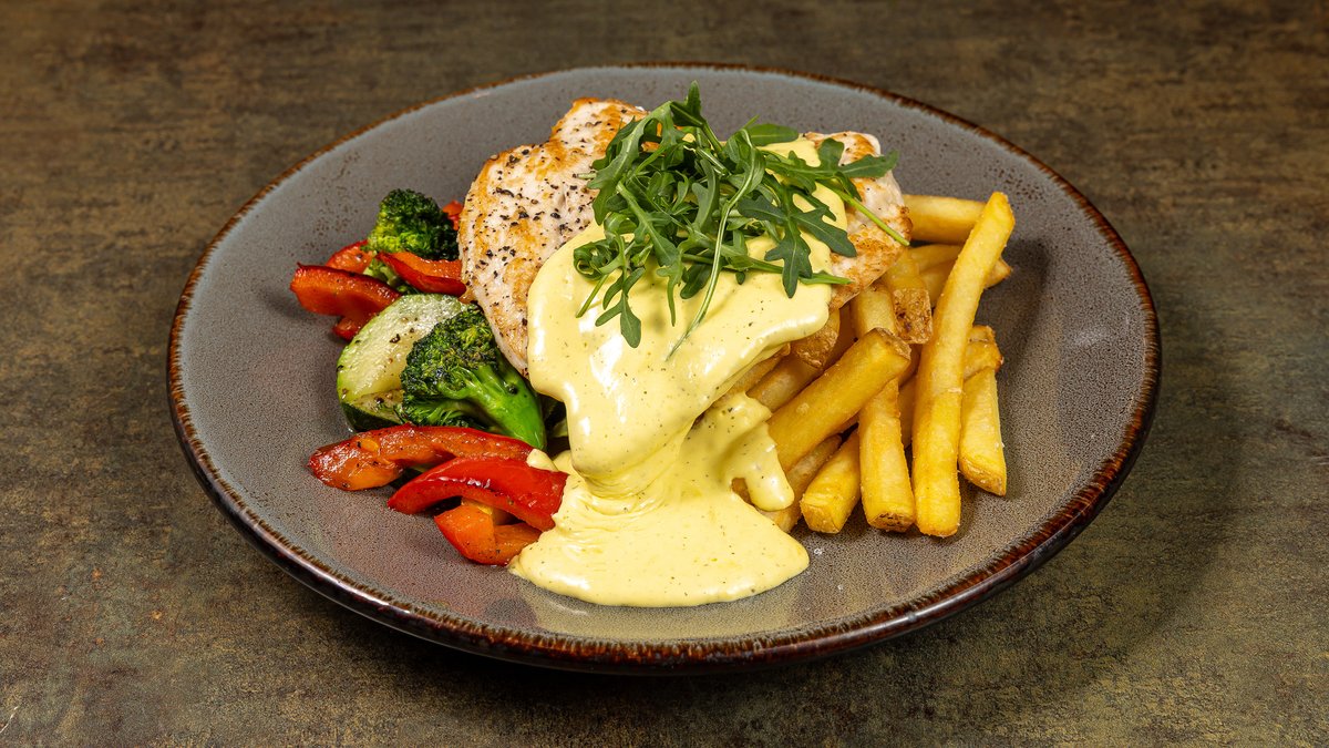Broilerin rintafilee n.160g, maalaisranskalaiset, paistetut kasvikset ja bearnaisekastike