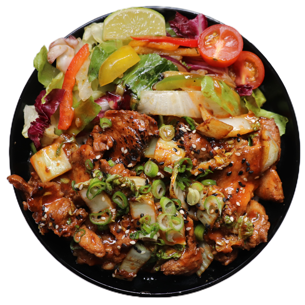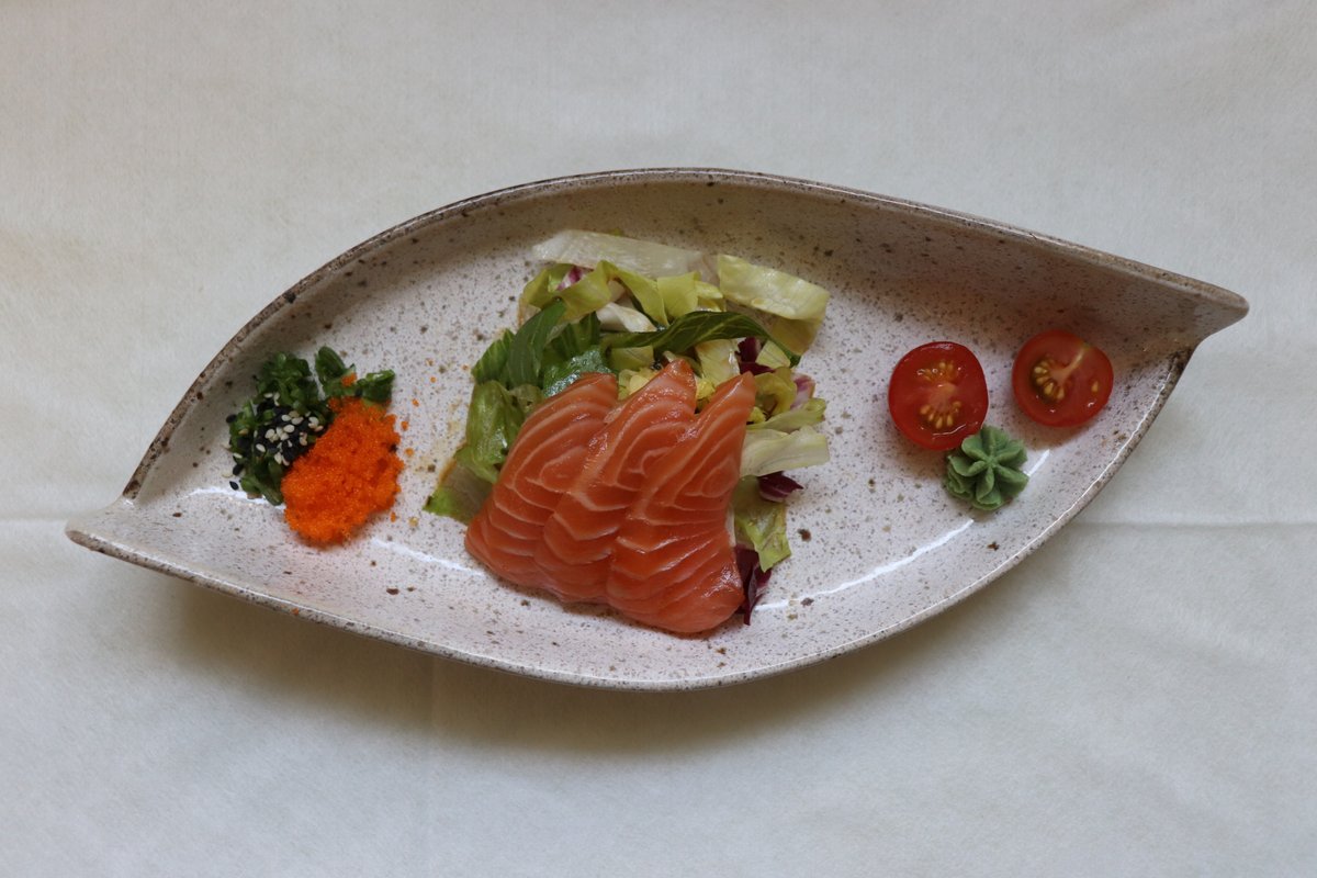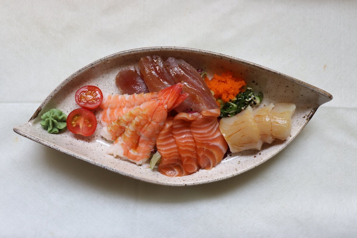 Chicken gyoza 6 kpl, Tostadas(lohella) 3 kpl, Sashimi: lohi 3 kpl, tonnikala 3 kpl, mäti. Nigiri: 3 x lohi, 3 x grillattu lohi, 3 x spicy valkokala, 3 x ebi california, 3 x avokado. Maki: seattle roll, hawaiian roll, california ebifry, futomaki.