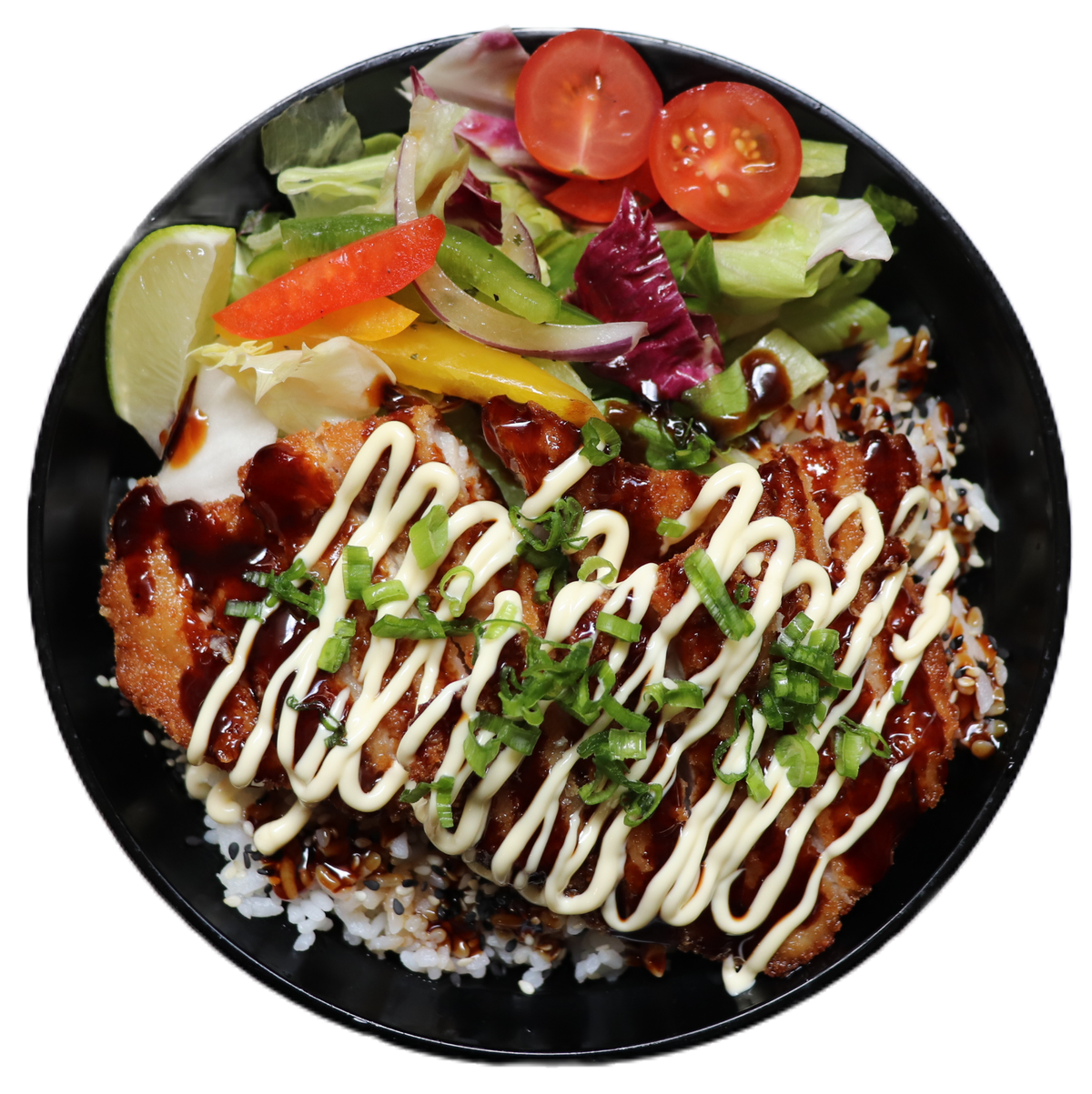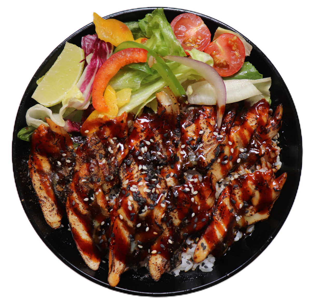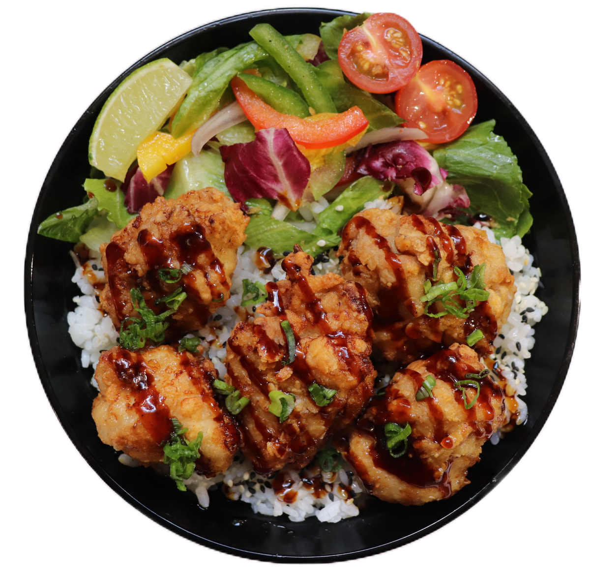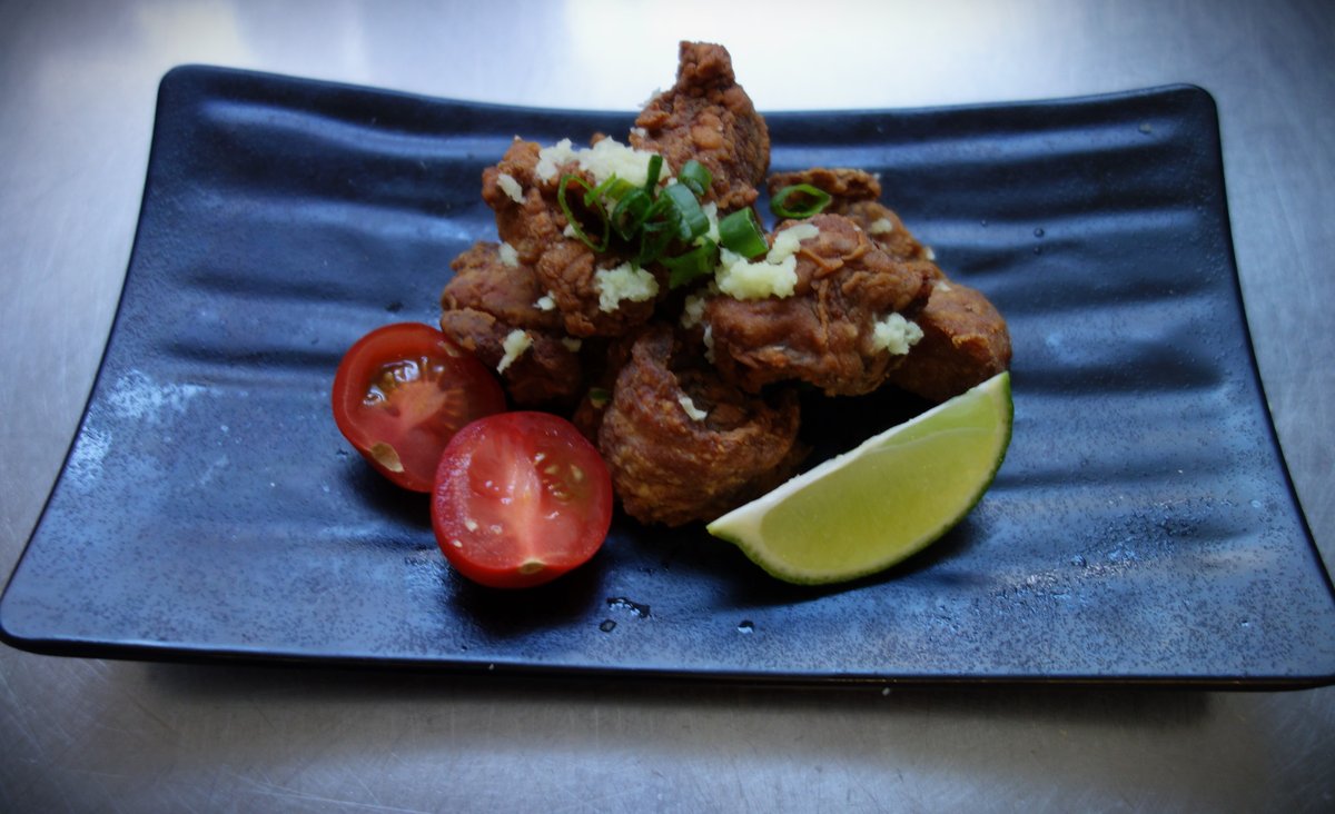 Karaage, kurkku, rucola, yakitori-kastike, majoneesi