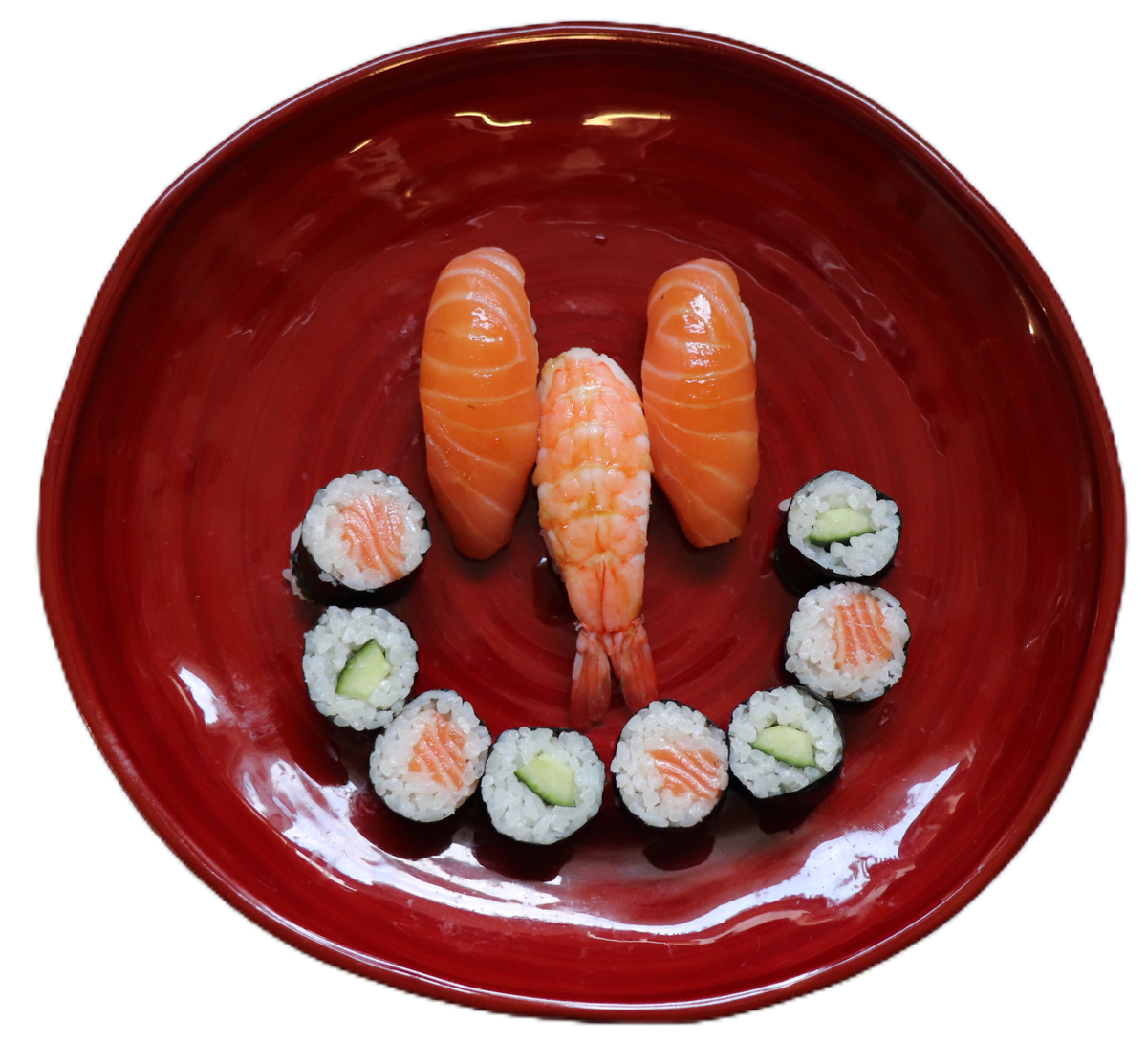 Maki: 4 x kurkku hosomaki, 4 x lohi hosomaki Nigiri: 2 x lohi, 1 x ebi