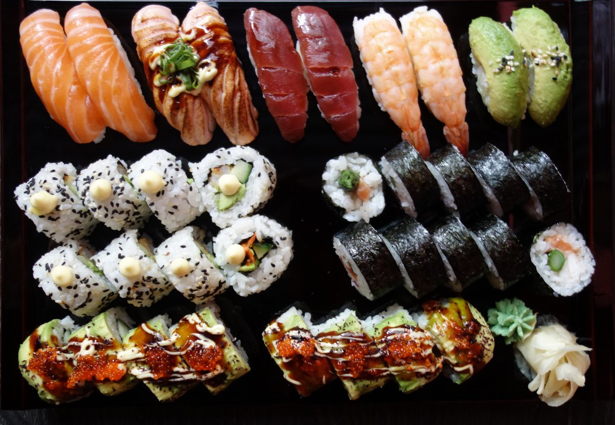 Maki: 5 x lohi avokado Nigiri: 2 x lohi, 1 x grillattu lohi, 1 x ebi california, 1 x avokado