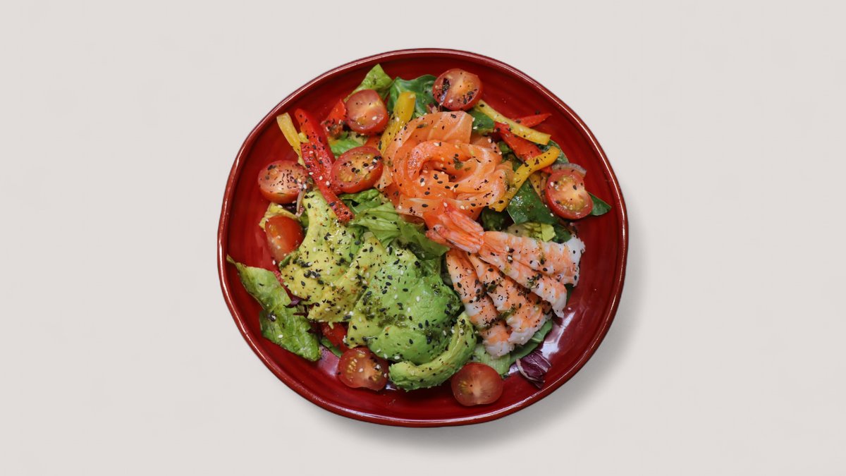 Katkarapu, avokado, kurkku, majoneesi, seesami