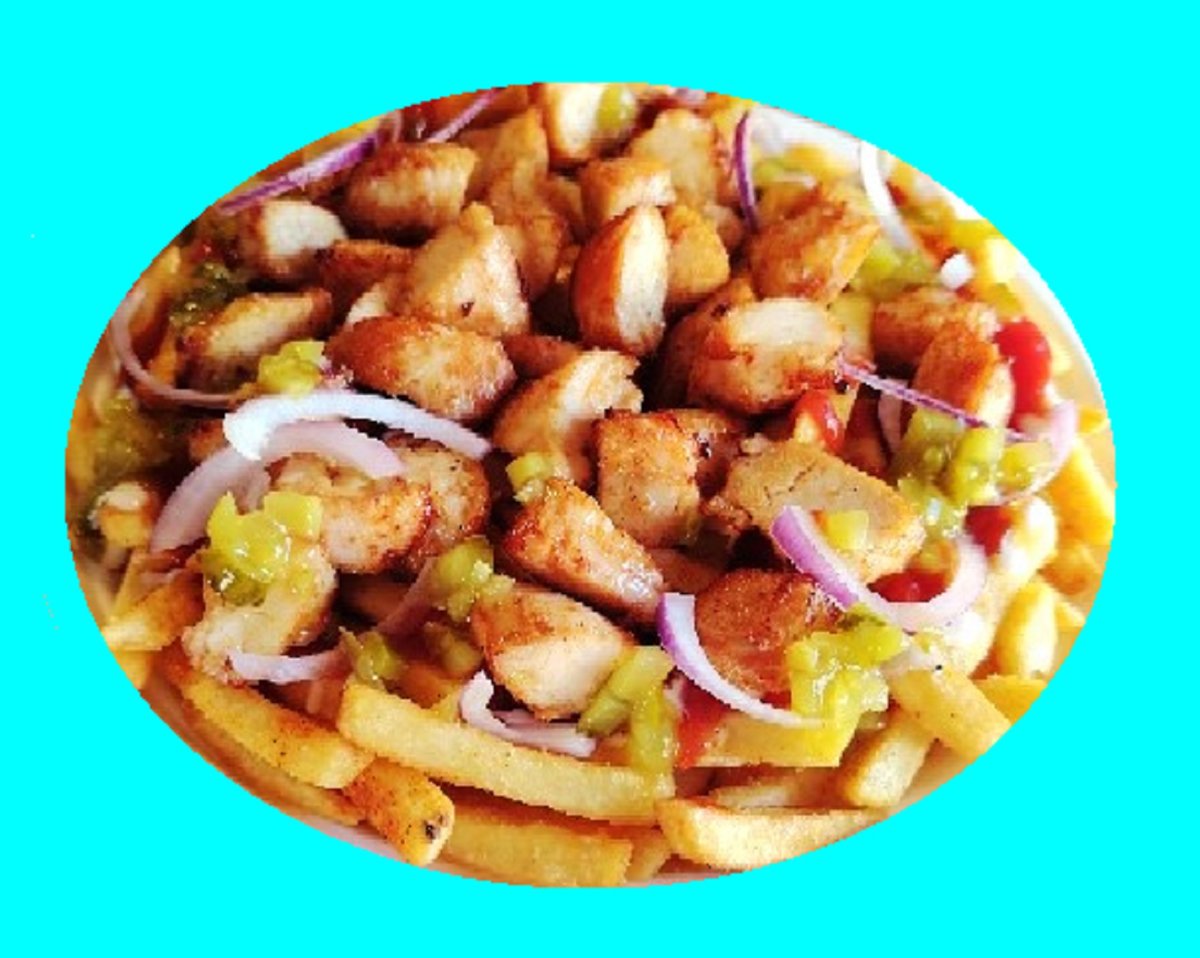 sis. grillattu kanafilettä curry mausteilla, avikon paksut-tikkuperunat, jäävuorisalaatti, tomaatti, suolakurkku, punasipuli, turkin pippuri, talon mojoneesi