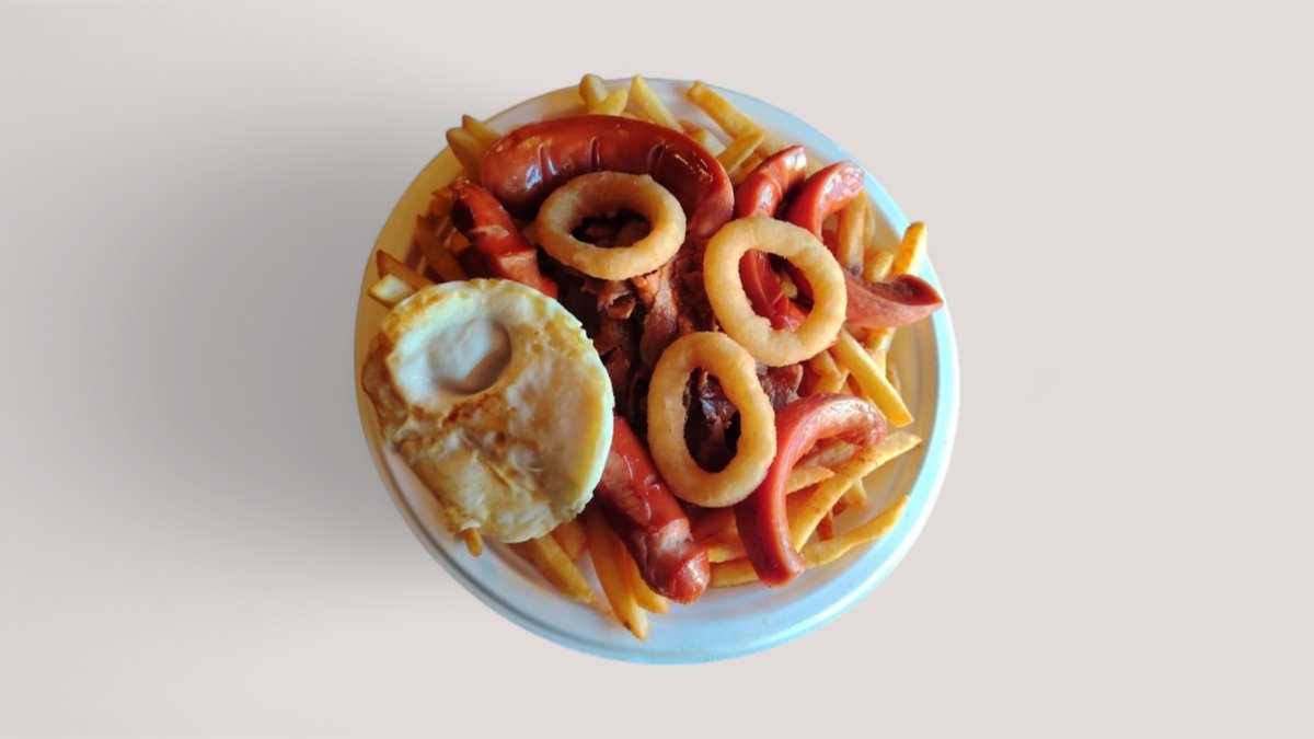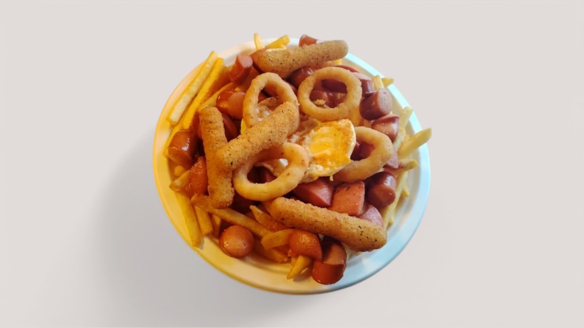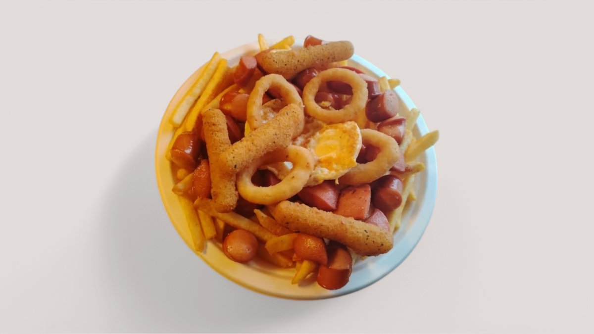 Rapeat ranskalaiset,125g täyslihapihvi, grillimakkara, kanafile, mozzerellatikut, sipulirengas, kanamuna.