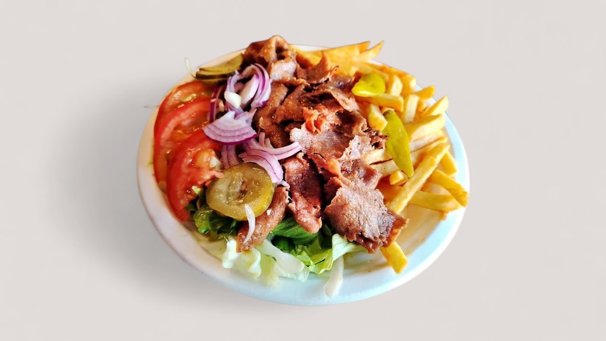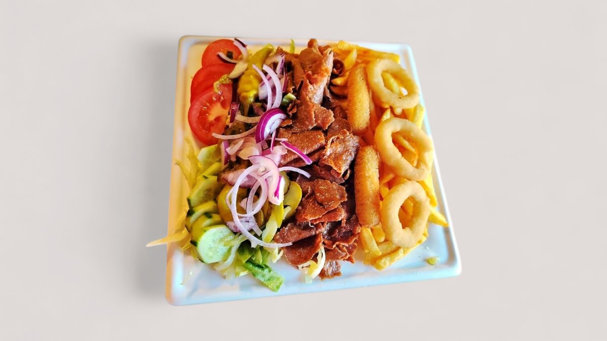 Parilapaistetty kebabliha , avikon paksut ranskalaiset, jäävuorisalaatti, tomaatti, punasipuli, suolakurkku, turkinpippuri, talon kebabkastike, talon majoneesi