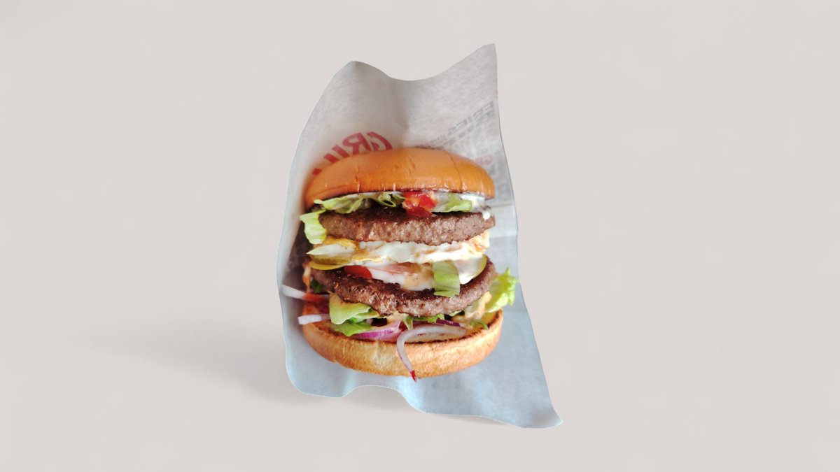 125gr täyslihapihvi, tuplajuusto ja kanamuna, punasipuli, tomaatti, suolakurkku, ketssuppi, burgerkastike