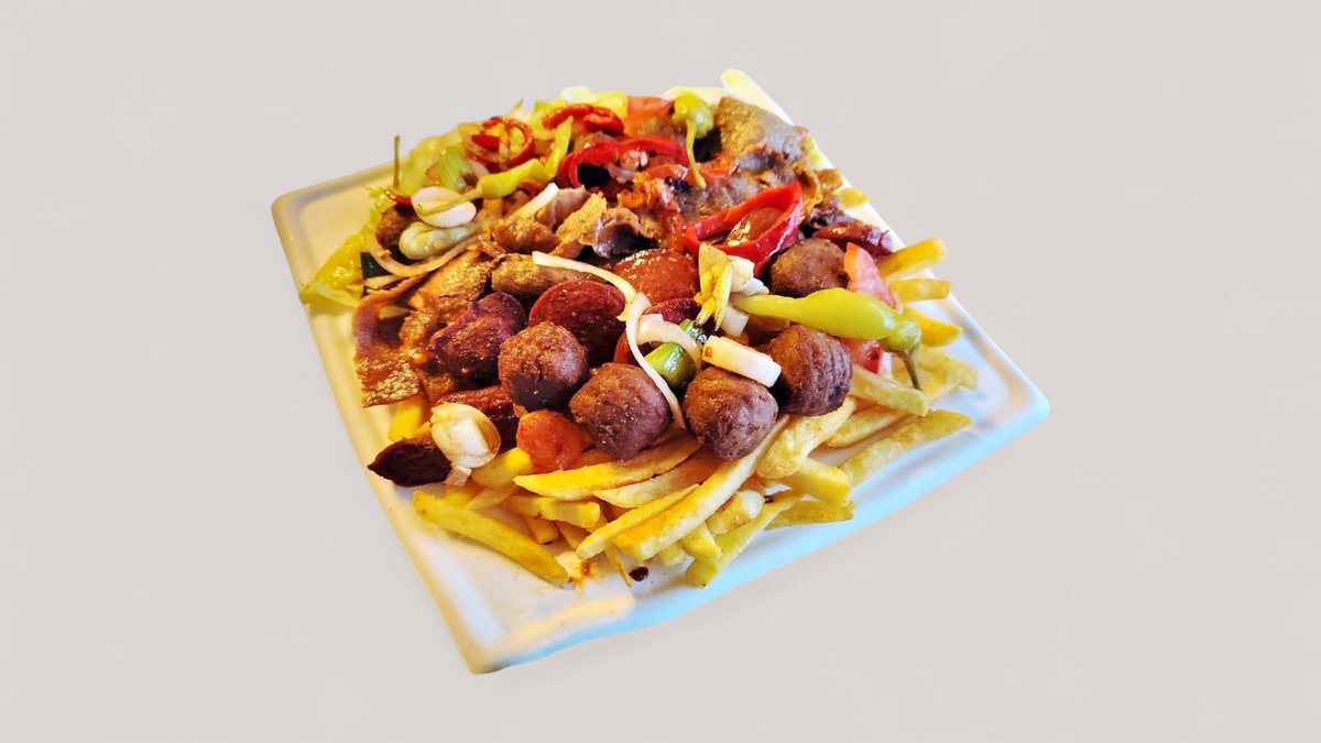 Paksut ranskanperunat, kebabliha, Turkinmakkara, lihapullat, grillikasvikset ja raikassalaatti