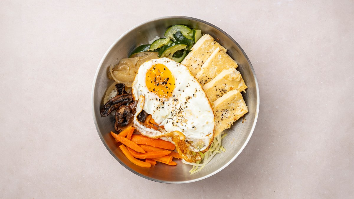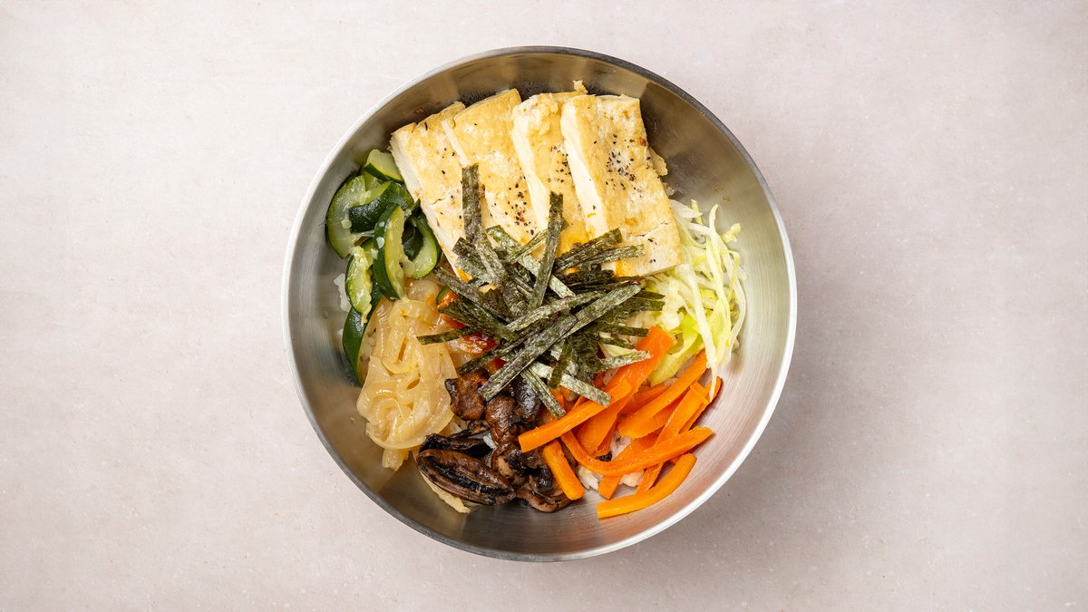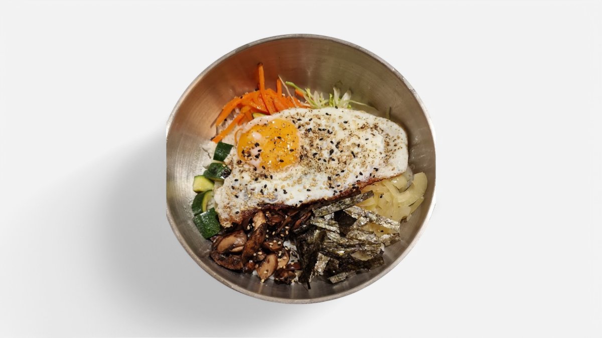 Sieni, sipuli, porkkana, salaatti, kesäkurpitsa, kuivattu merilevä, bibimbap-kastike, seesamiöljy, paistettu kananmuna, grillattu tofu (VE,L) sisältää soijaa