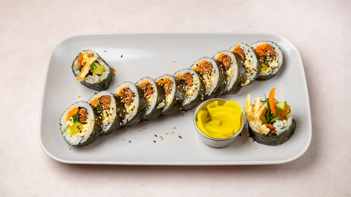 Valitsemasi puolikas gimbab + puolikas tokpokki (tokpokki sisältää liha tuoteita (0,06g))
