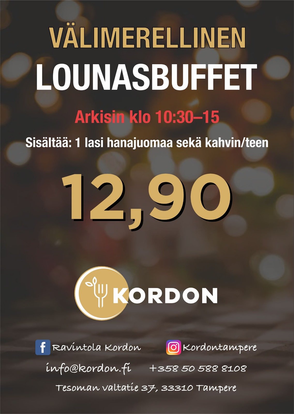 Vain arkisin 10:30-15. Lounasbuffetista ruokaa pakattuna.