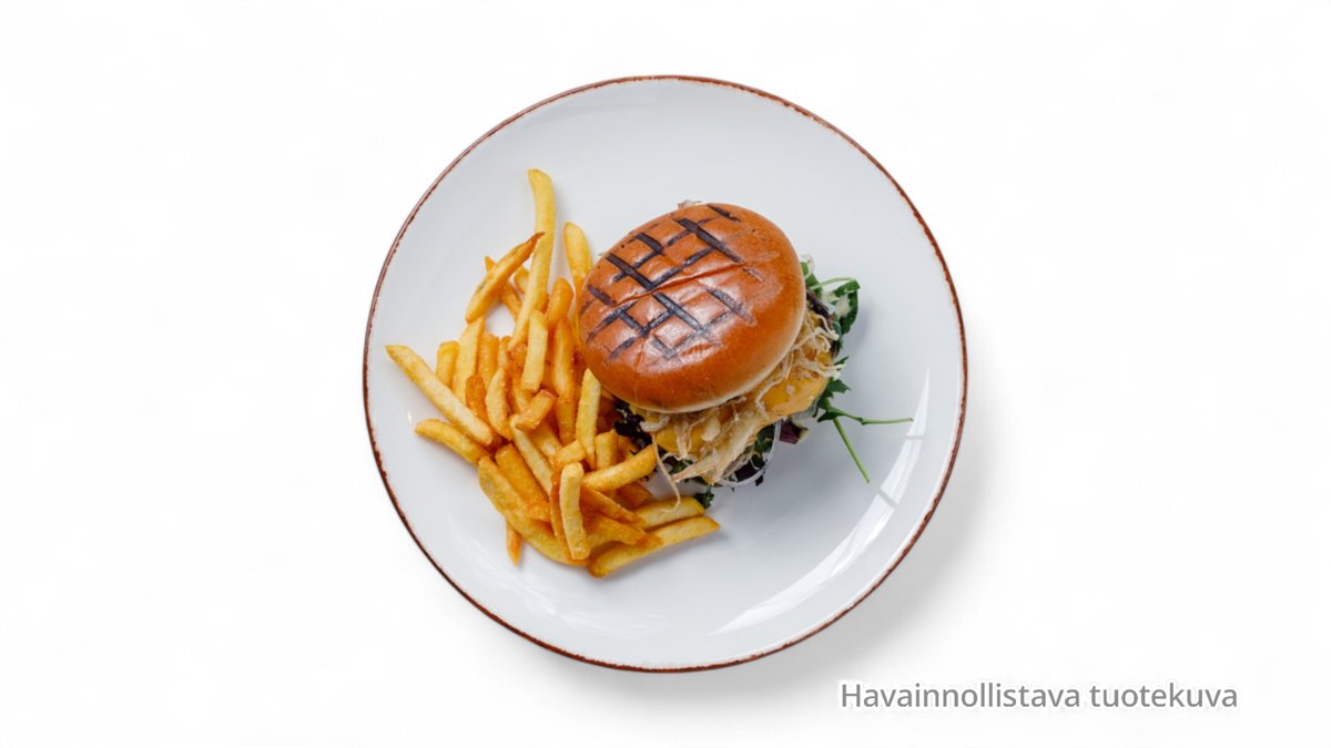 Briossi sämpylän välissä 80g 100% naudan smashpihvi, ketsuppia, sipulia, suolakurkkua, cheddarjuusto sekä aiolimajoneesi
