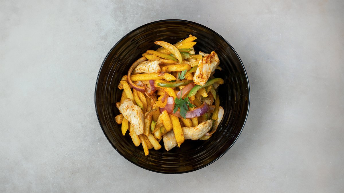 Mix bell pepper, mix spice, white onion, fries, chicken, spring onion
