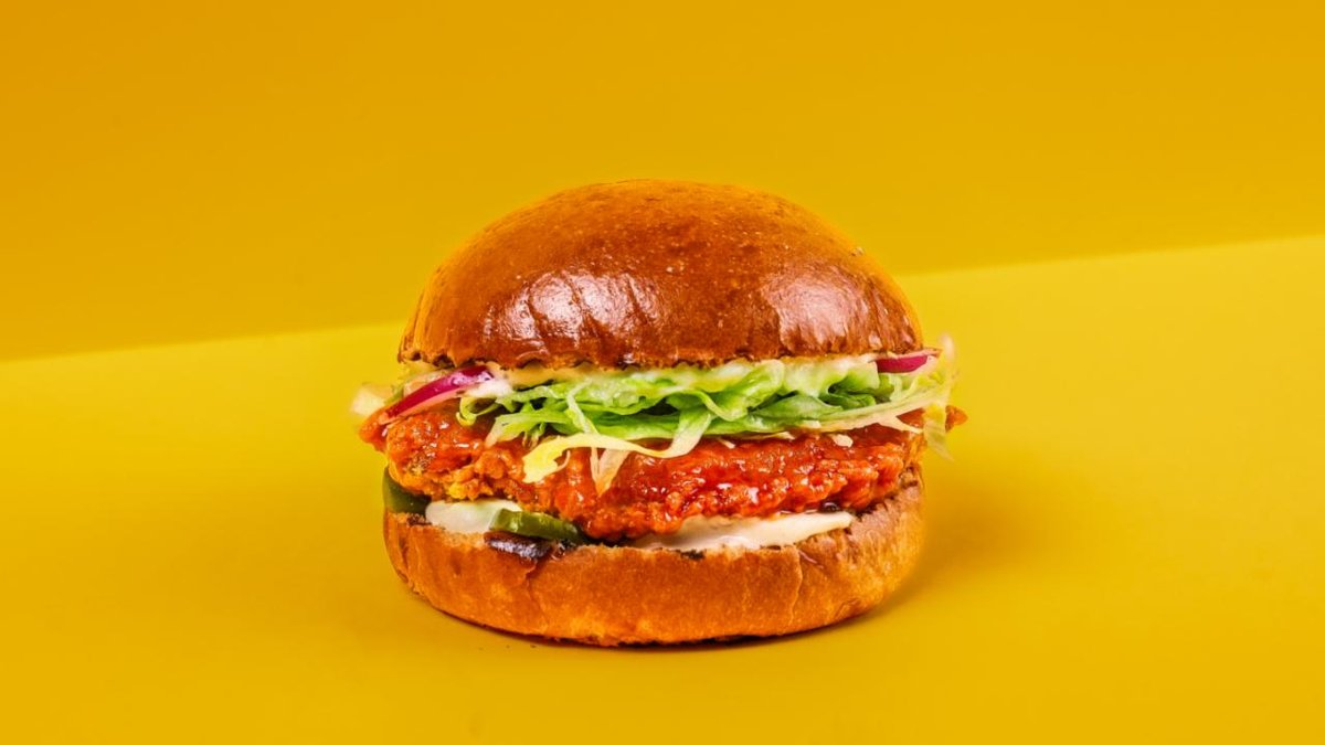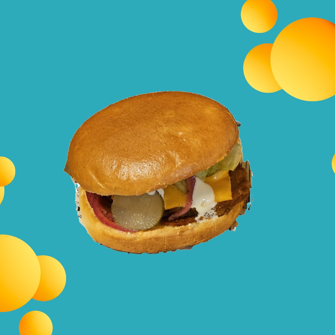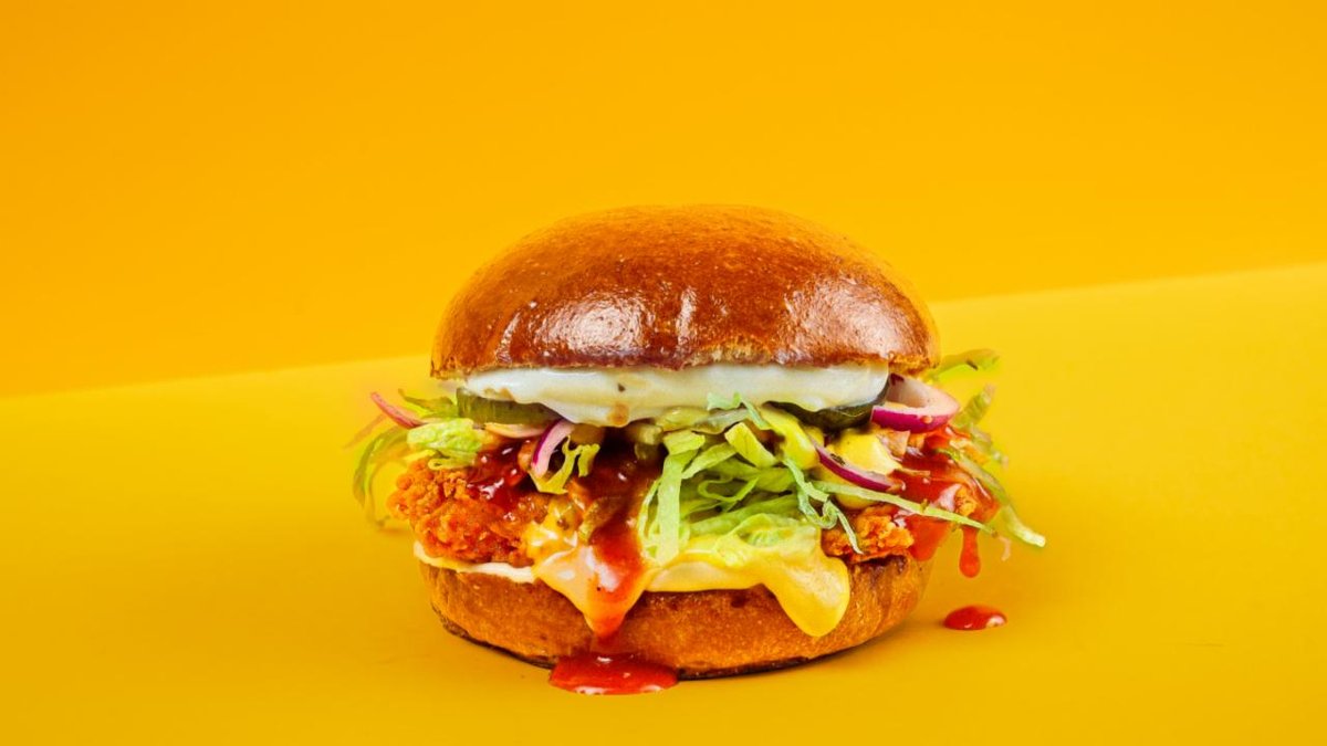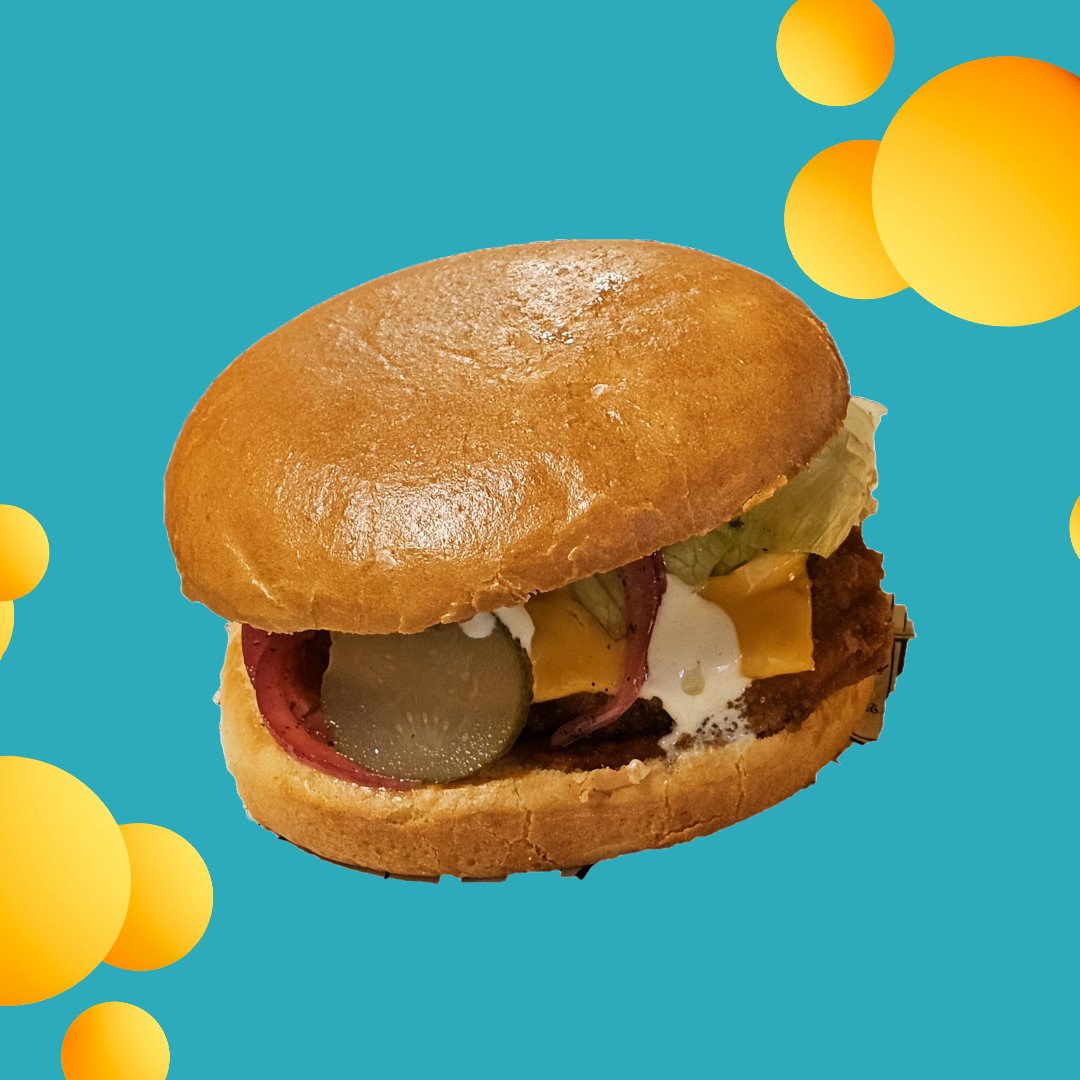 Briossisämpylä, kanapihvi, korealainen makea chilikastike, cheddarjuusto, aioli, curry-mango majoneesi, salaatti, maustekurkku, punasipuli.