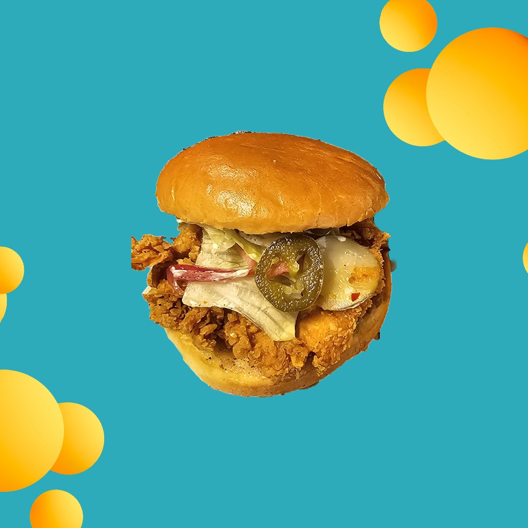 Briossisämpylä, kanapihvi, korealainen makea chilikastike, aioli, salaatti, jalapeno, pikkelöity punasipuli.