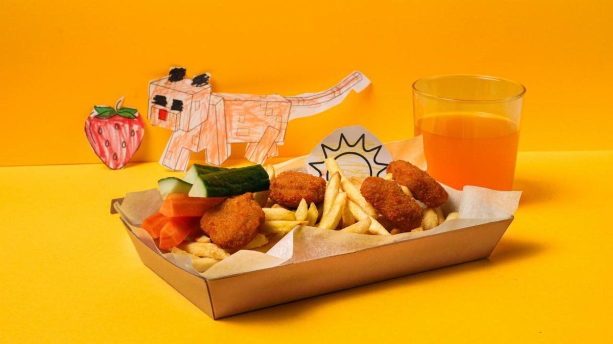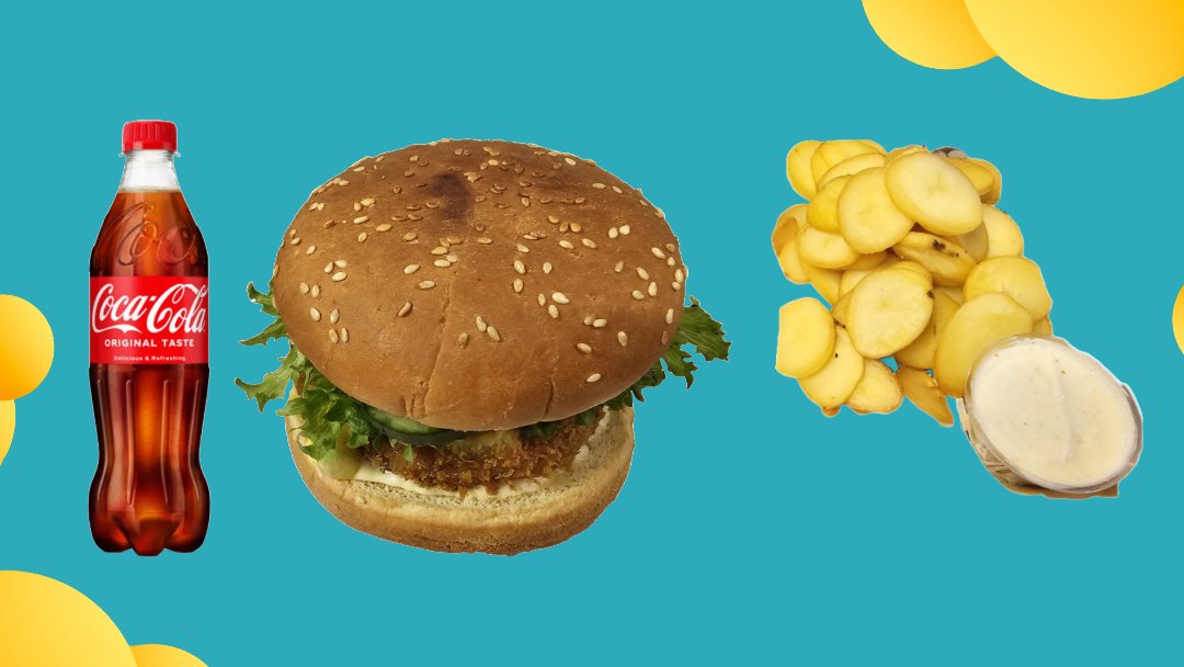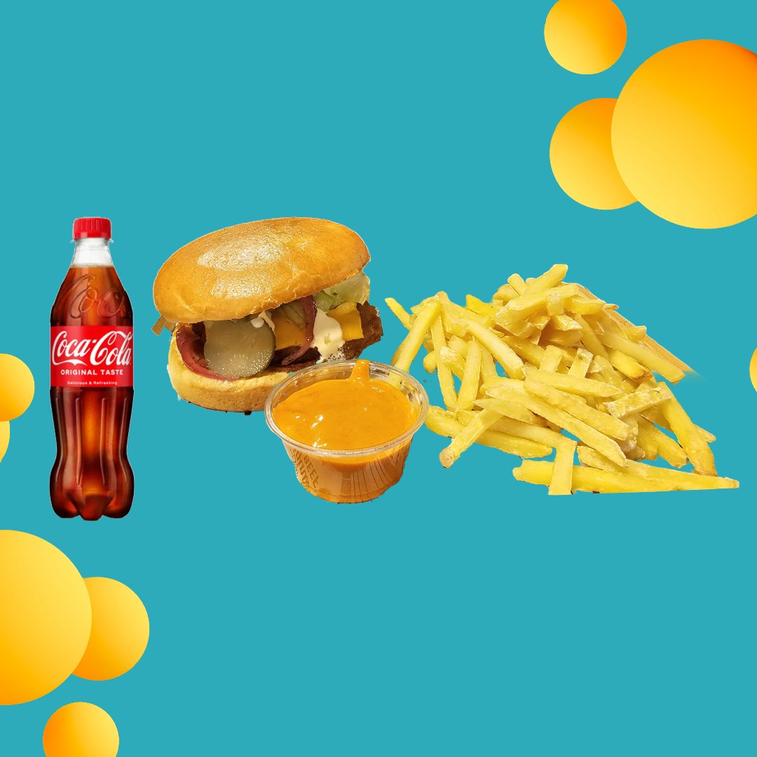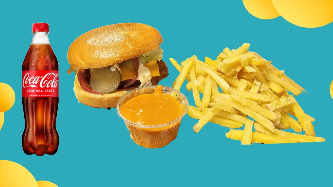 Friteerattu ja viipaloitu kanapihvi, ranskalaisia, dippeinä mukaan tulee ketsuppi ja curry-mango majoneesi, sekä valitsemasi 0,33 l juoma.