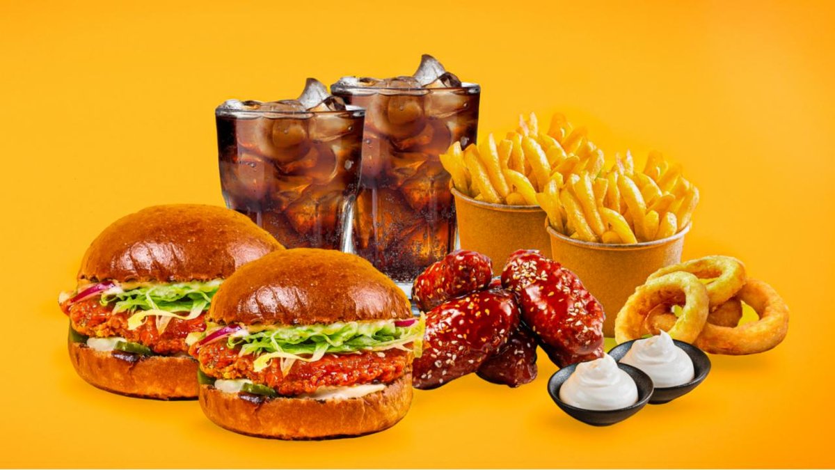 2 kpl Chicken Korean Burger, 4 kpl siipiä korealaisella makealla chilikastikkeella, 4 kpl sipulirenkaita, 2 annosta ranskalaisia, 2 kpl 0,33 l juomaa ja 2 valitsemaasi dippiä.