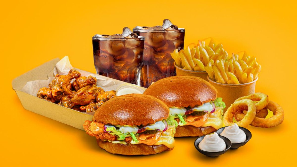 2 kpl Chicken Buffalo Burger, 12 kpl siipiä buffalokastikkeella, 4 kpl siipiä korealaisella makealla chilikastikkeella, 2 annosta ranskalaisia, 2 kpl 0,33 l juomaa ja 2 valitsemaasi dippiä.