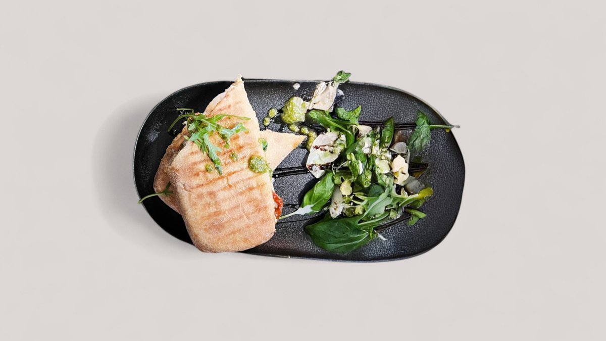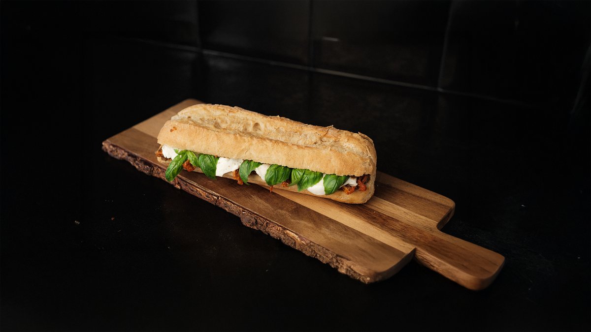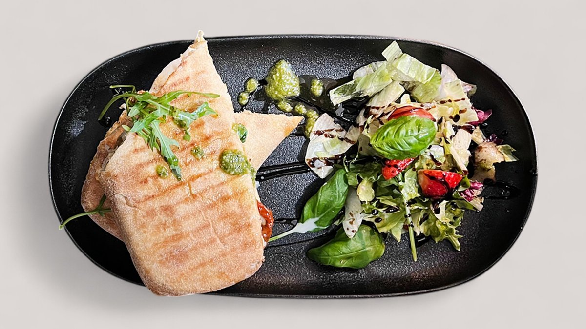 Mozzarella, pesto, tomaatti, basilika, aurinkokuivattu tomaatti