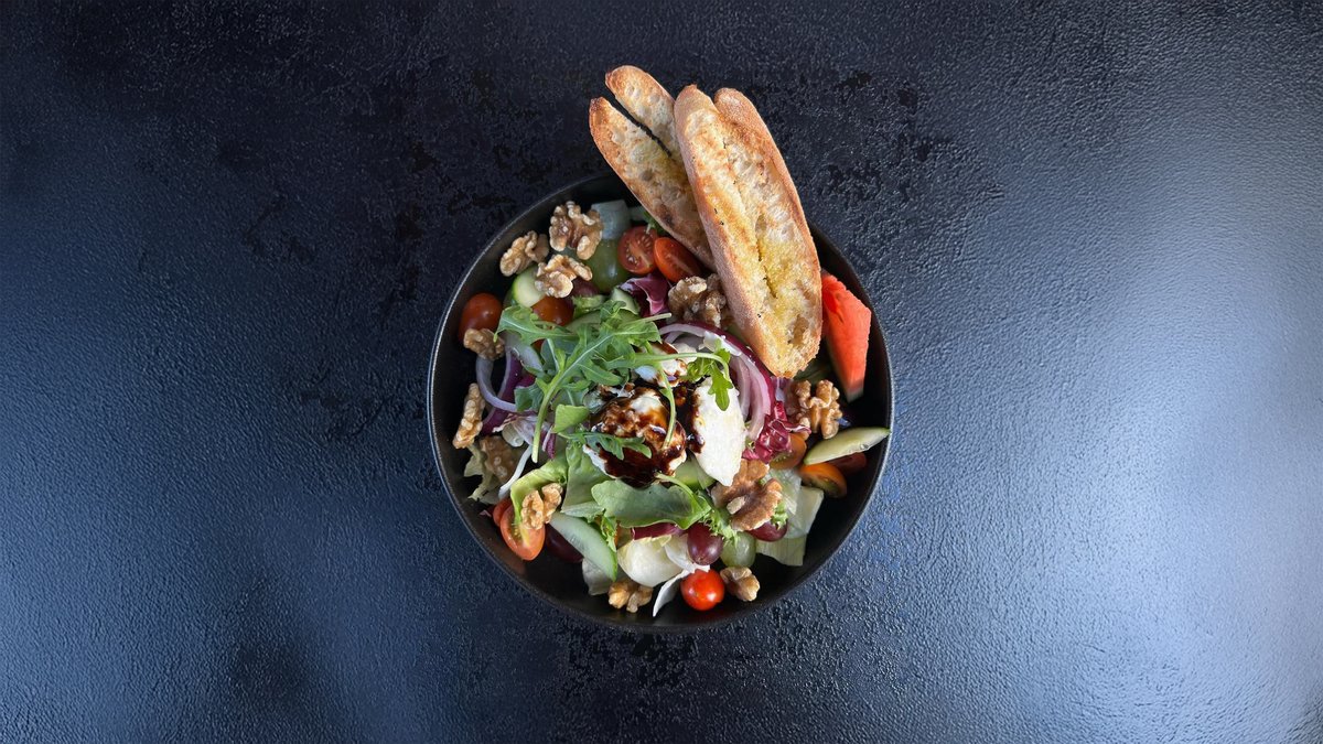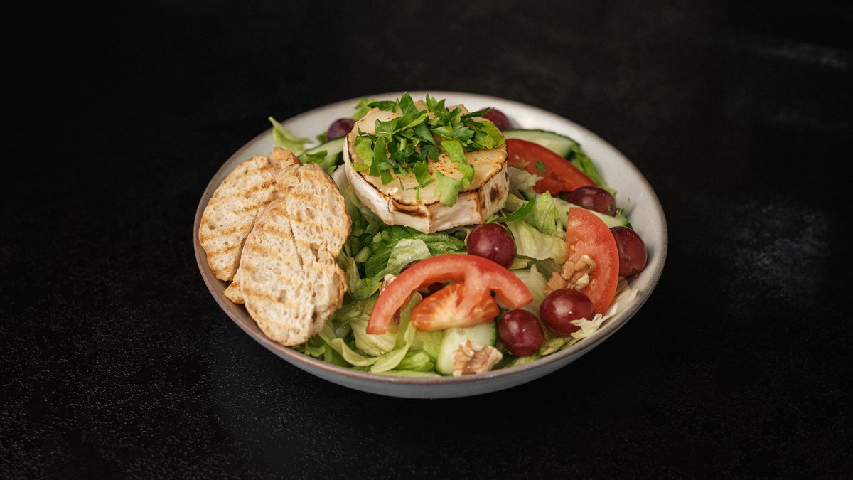 Salaattisekoitus, vuohenjuusto, tomaatti, kurkku, marinoitu sipuli, saksanpähkinä, viinirypäle, leipä, oliiviöljy