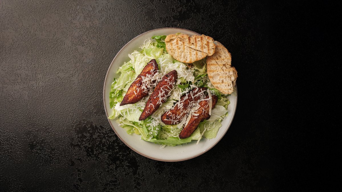 Salaattisekoitus, kanafilee, leipäkuutio, parmesaani, caesar-kastike
