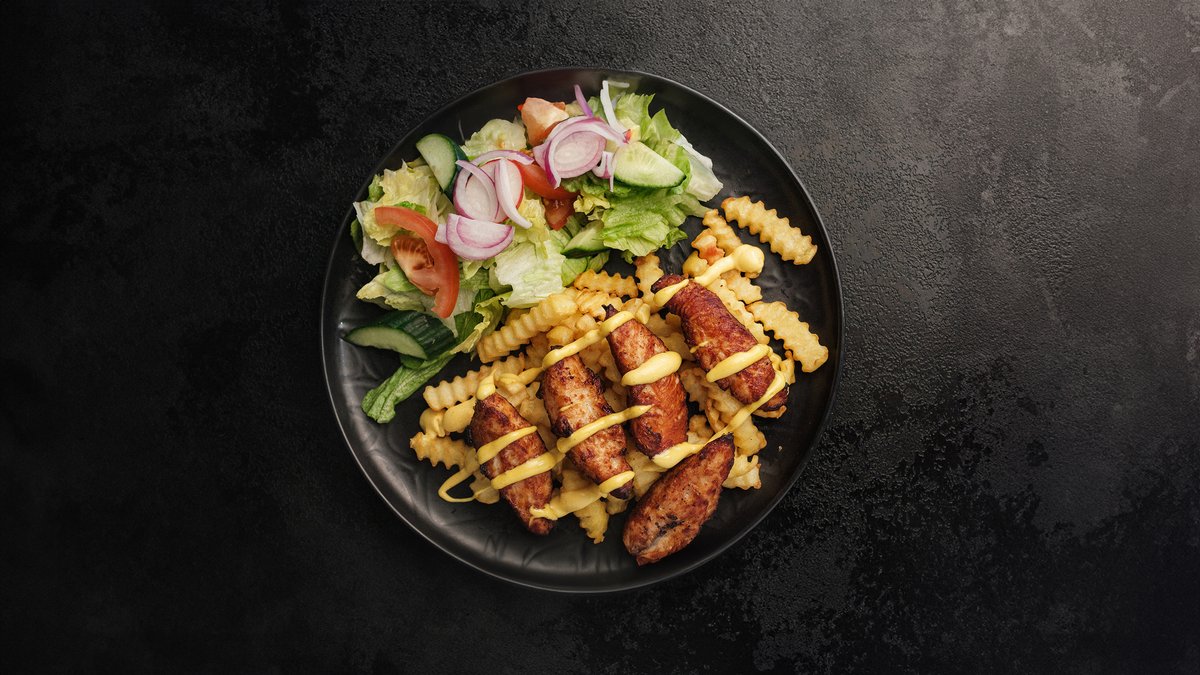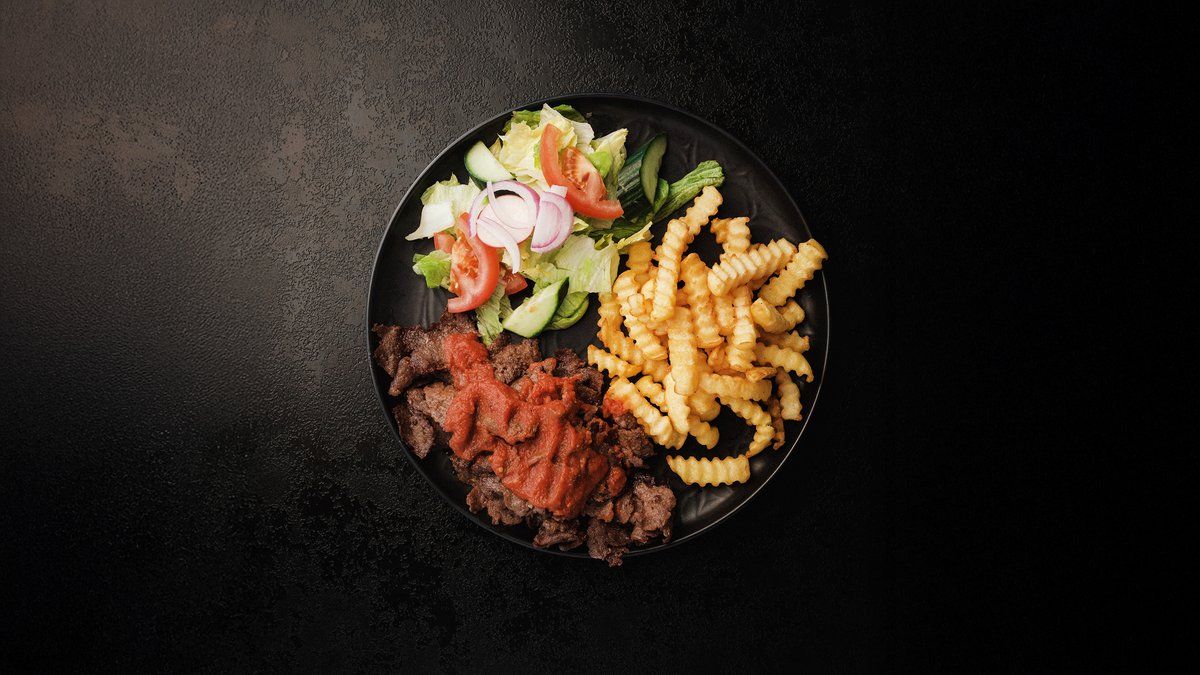 Kebabliha,ranskalaiset,salaatti, kastikkeet