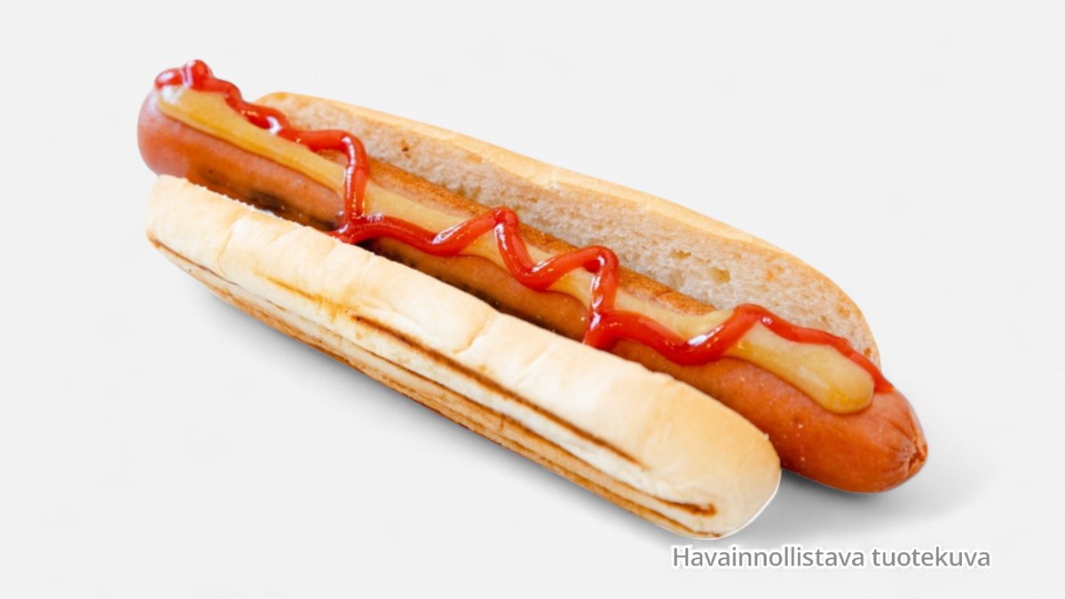 Perinteinen grilliherkku! Rapeita ranskalaisia, herkullisia nakkeja ja runsaasti makua. Päälle ketsuppia, sinappia, kurkkusalaattia, sipulia, salaattia ja majoneesia