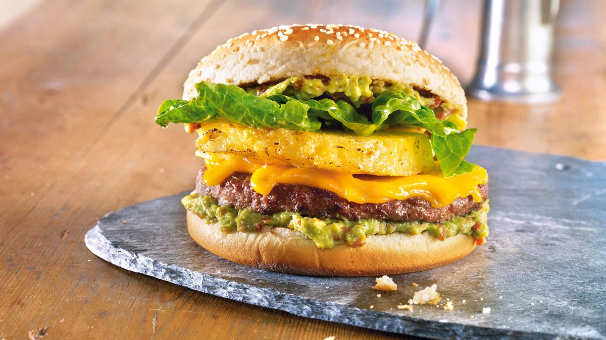 Mehevä hampurilainen, jossa pihvi, mehukas ananasviipale, salaatti, kurkkusalaatti ja sipuli sekä majoneesi ja ketsuppi pehmeän sämpylän välissä.