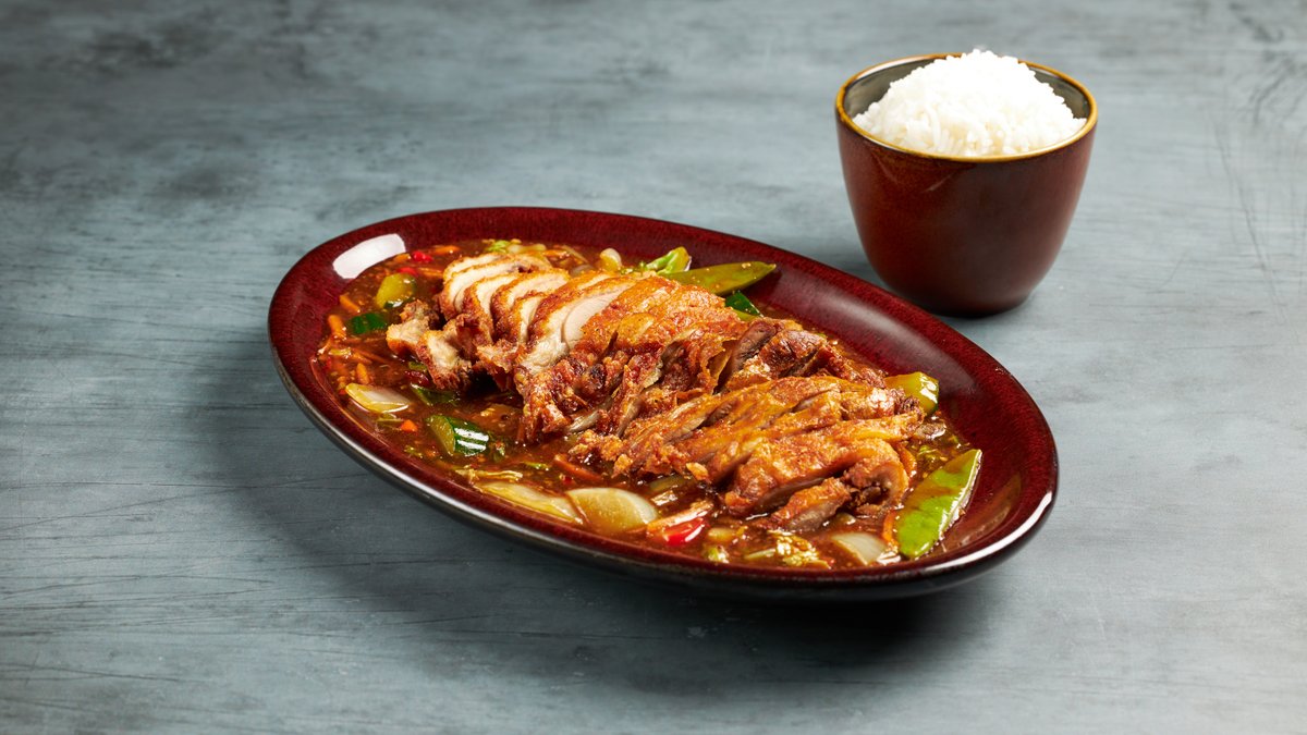 Kana, Katkarapu, kananmuna, porkana, herne, Purjo, Szechuan kastikkeessa