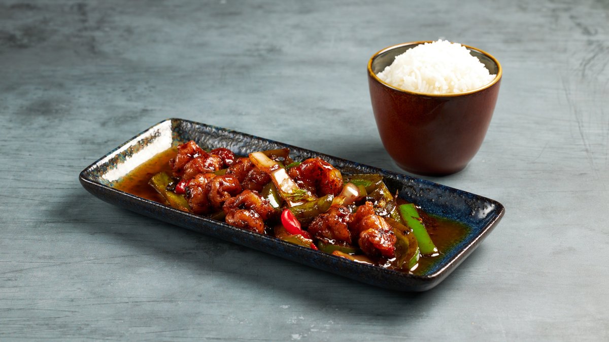 Sipuli, paprika, valkosipuli, inkivääri mustapapu, tuorechili, osterikastike, pankojauho (M, L, VS)