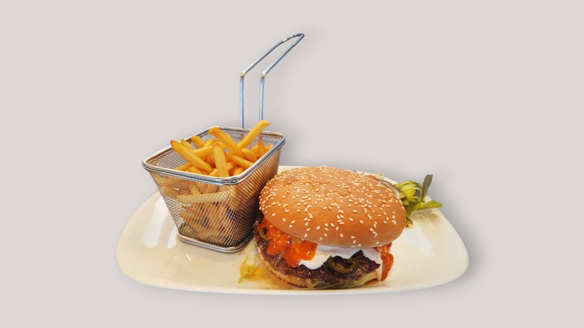 Täyslihapihvi, cheddar - juusto, paistettu sipuli ja jalopeno